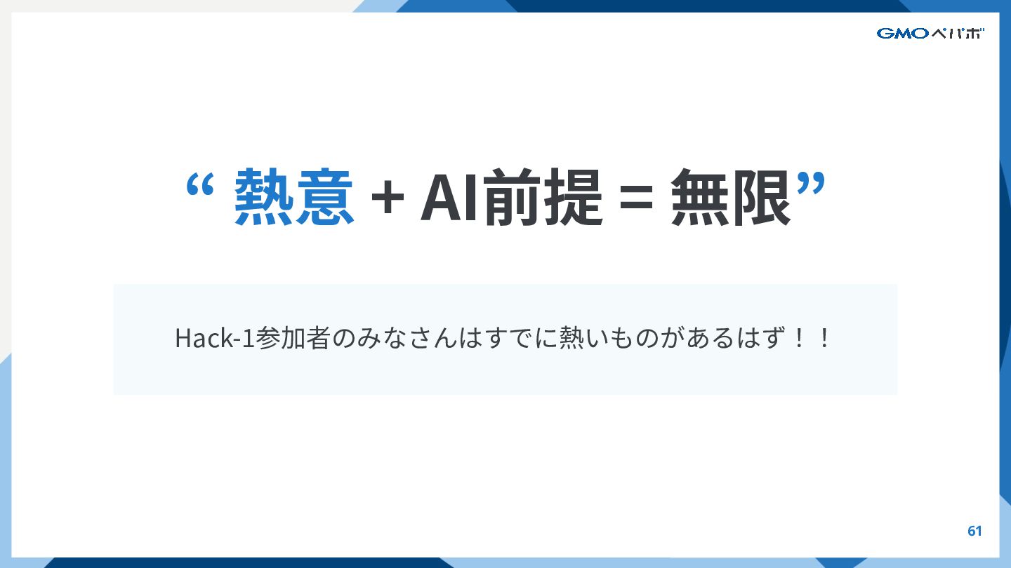 61 Hack-1参加者のみなさんはすでに熱いものがあるはず!! “ 熱意 + AI前提 = 無限” AI前提の時代でどうすればいいか