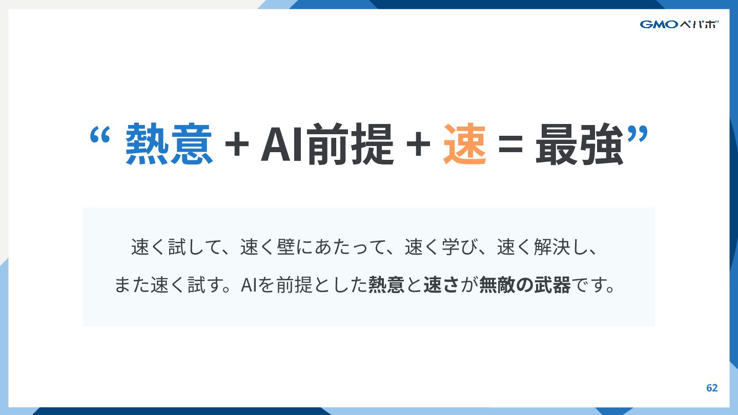 62 速く試して、速く壁にあたって、速く学び、速く解決し、 また速く試す。AIを前提とした熱意と速さが無敵の武器です。 “ 熱意 + AI前提 + 速 =