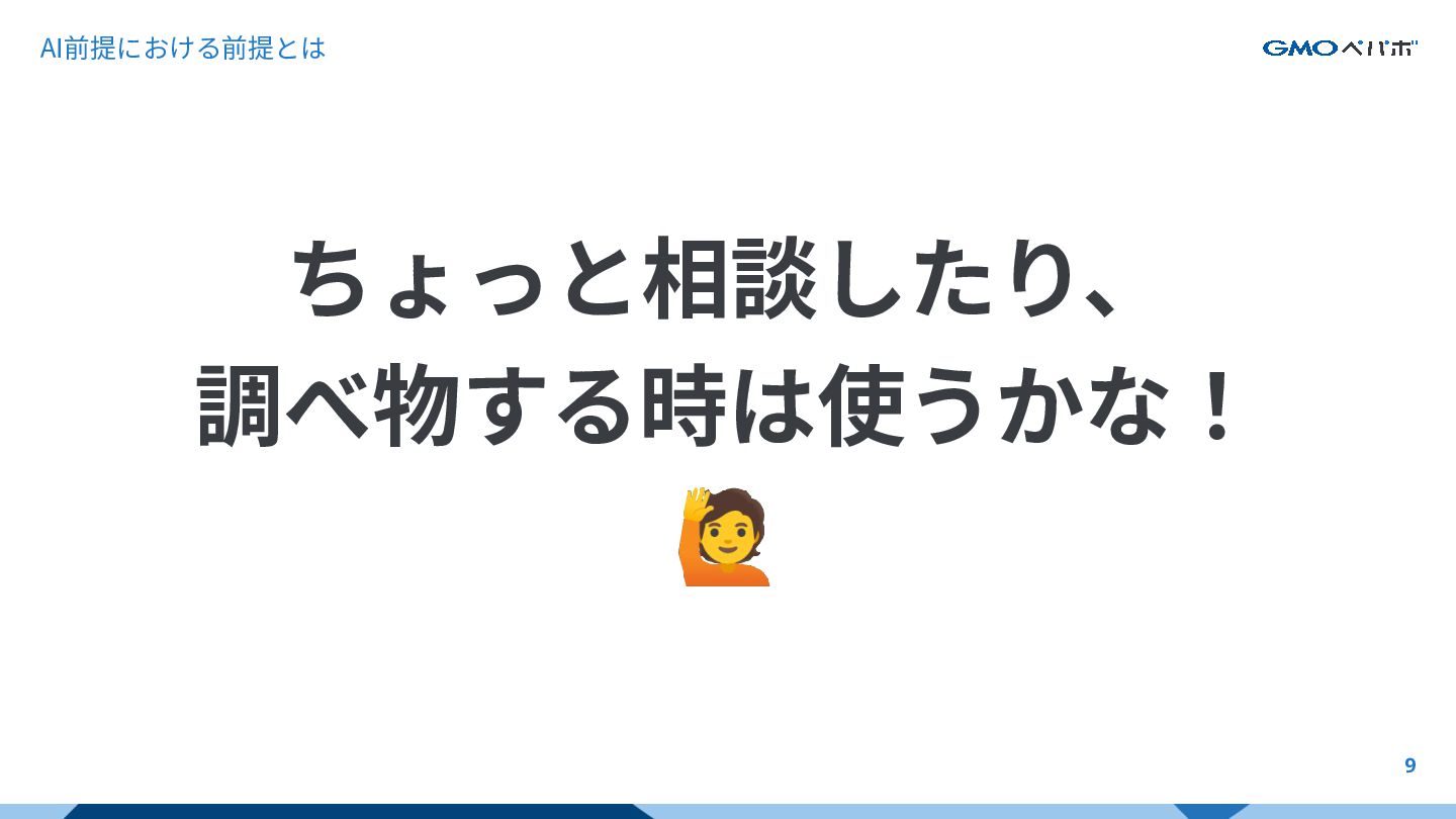 9 ちょっと相談したり、 調べ物する時は使うかな! 🙋 AI前提における前提とは