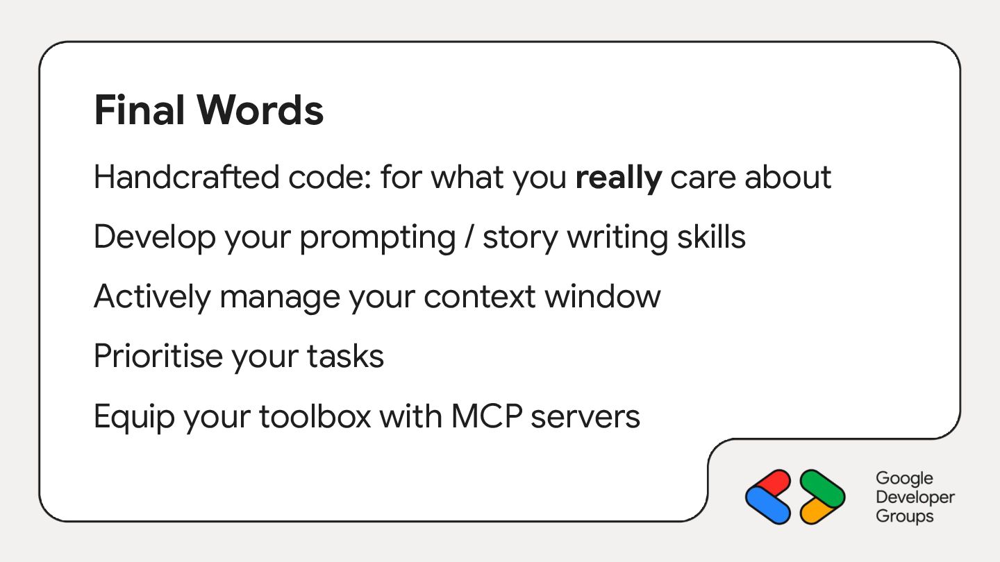 Develop your prompting / story writing skills Actively manage your context window Prioritise your tasks Equip your toolbox with MCP servers