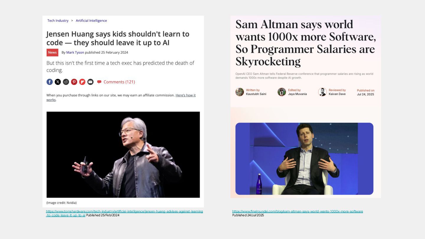 https://www.tomshardware.com/tech-industry/artificial-intelligence/jensen-huang-advises-against-learning -to-code-leave-it-up-to-ai Published 25/Feb/2024 https://www.finalroundai.com/blog/sam-altman-says-world-wants-1000x-more-software Published 24/Jul/2025
