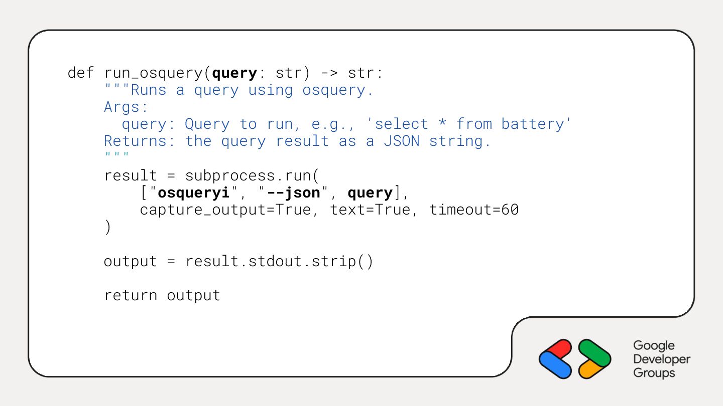 5. def run_osquery(query: str) -> str: """Runs a query using osquery.