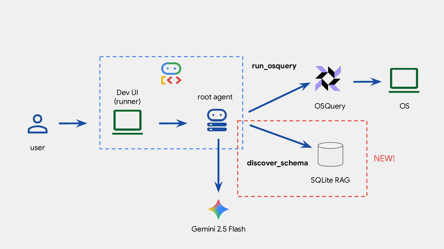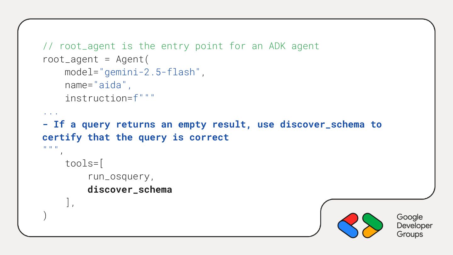 root_agent = Agent( model="gemini-2.5-flash", name="aida", instruction=f""" ... - If a query returns an empty result, use discover_schema to certify that the query is correct """, tools=[ run_osquery, discover_schema ], )