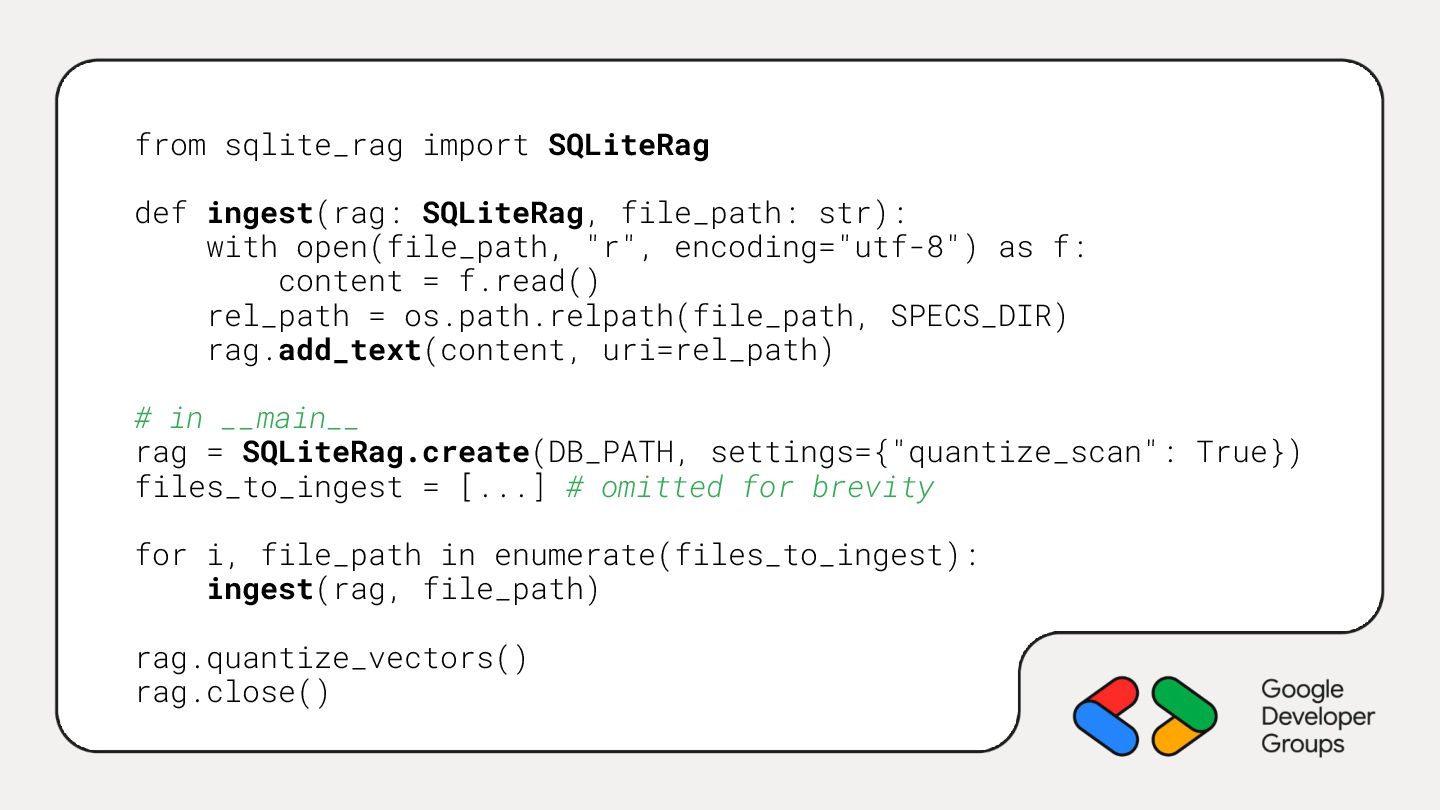 open(file_path, "r", encoding="utf-8") as f: content = f.read() rel_path = os.path.relpath(file_path, SPECS_DIR) rag.add_text(content, uri=rel_path) # in __main__ rag = SQLiteRag.create(DB_PATH, settings={"quantize_scan": True}) files_to_ingest = [...] # omitted for brevity for i, file_path in enumerate(files_to_ingest): ingest(rag, file_path) rag.quantize_vectors() rag.close()
