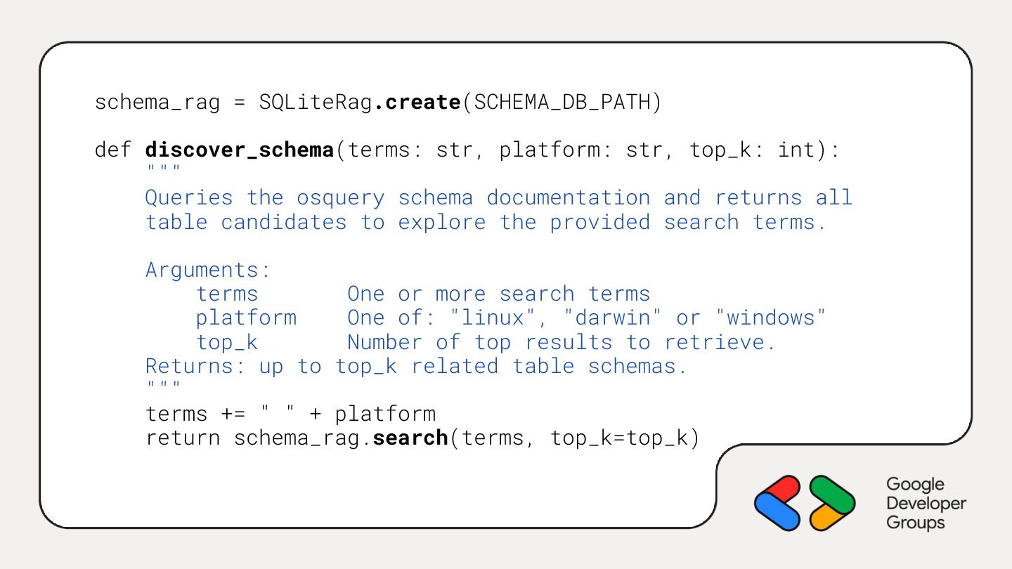 9. schema_rag = SQLiteRag.create(SCHEMA_DB_PATH) def discover_schema(terms: str, platform: str, top_k: int):