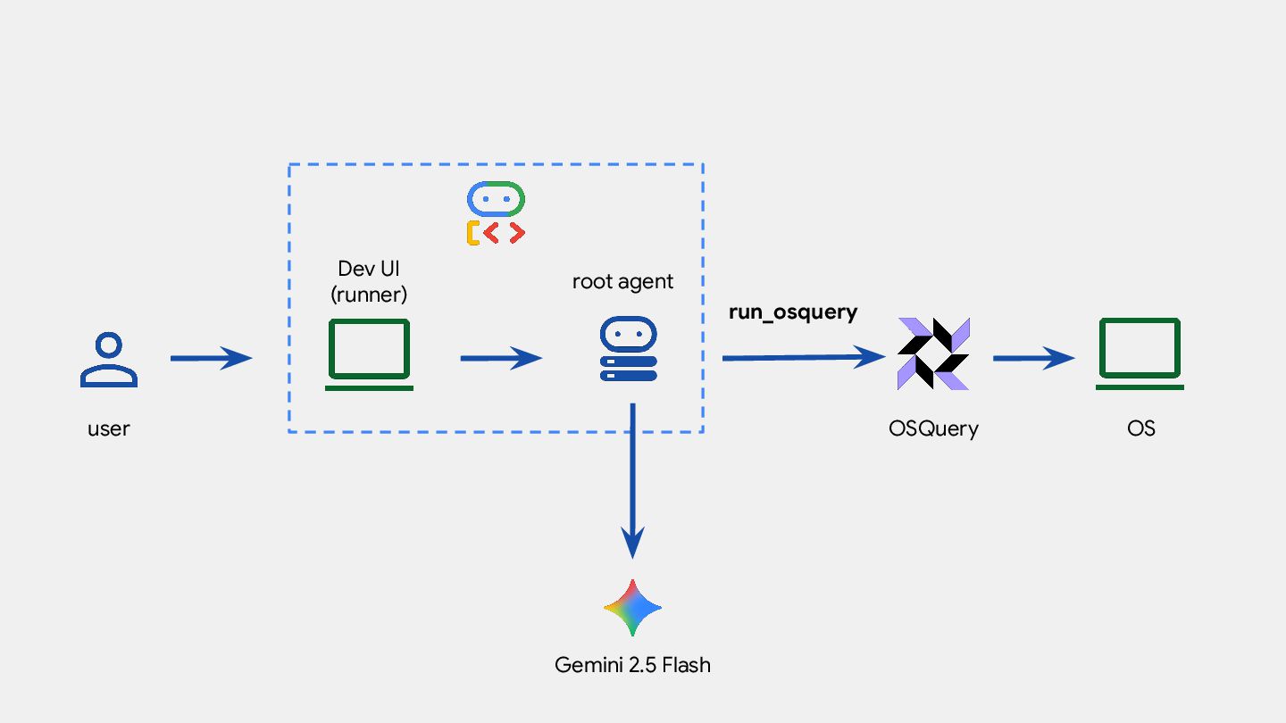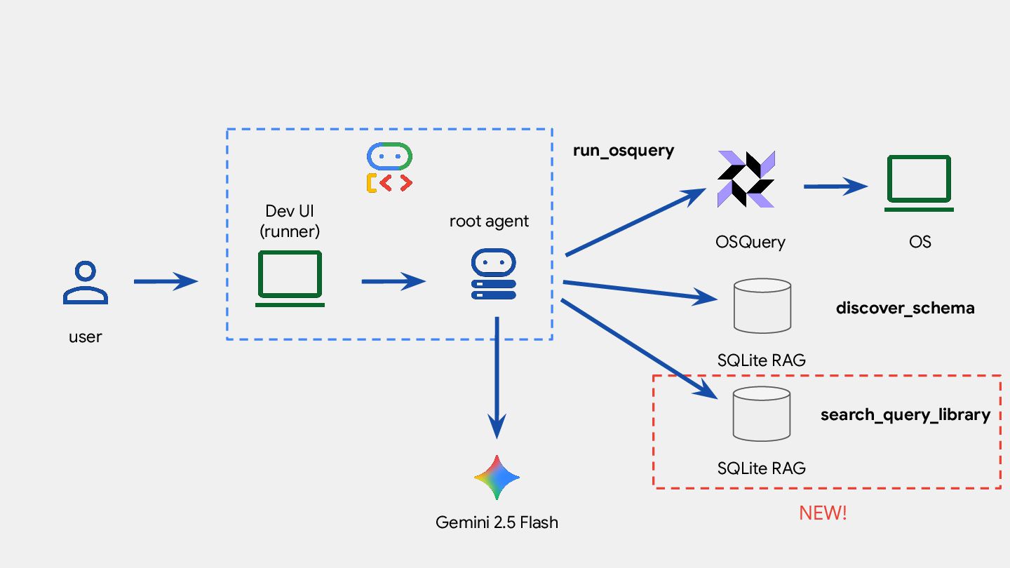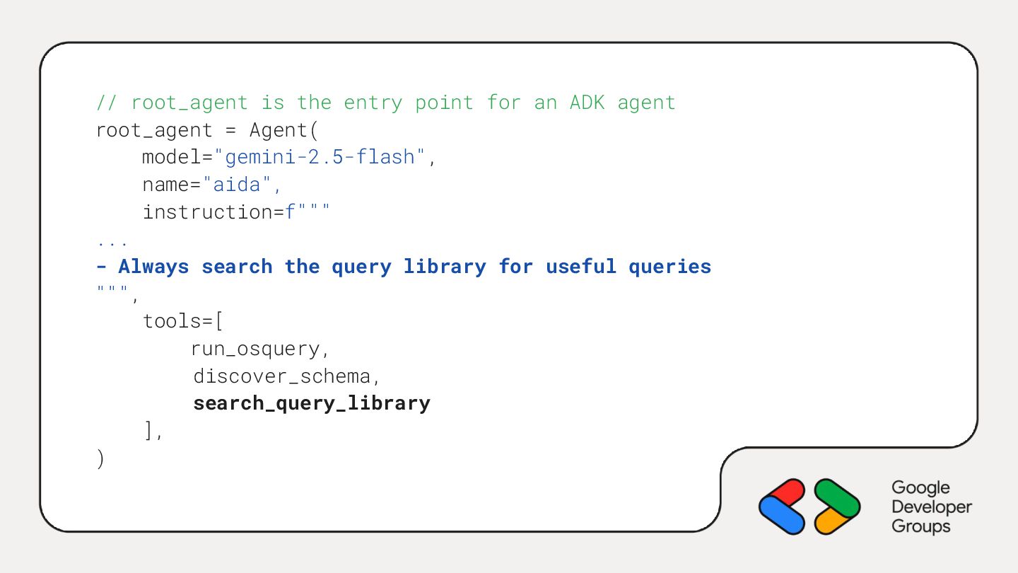 root_agent = Agent( model="gemini-2.5-flash", name="aida", instruction=f""" ... - Always search the query library for useful queries """, tools=[ run_osquery, discover_schema, search_query_library ], )