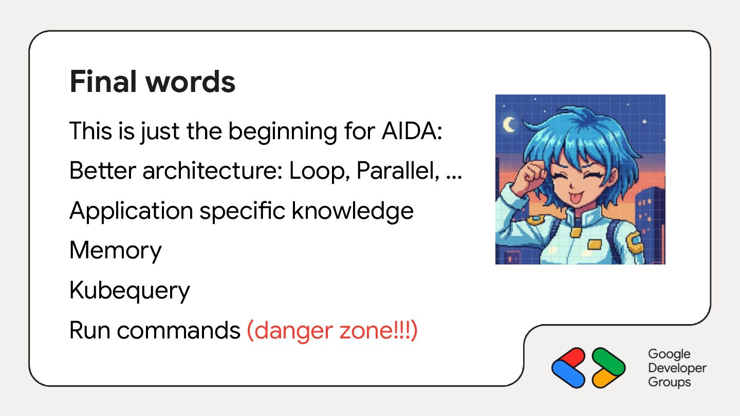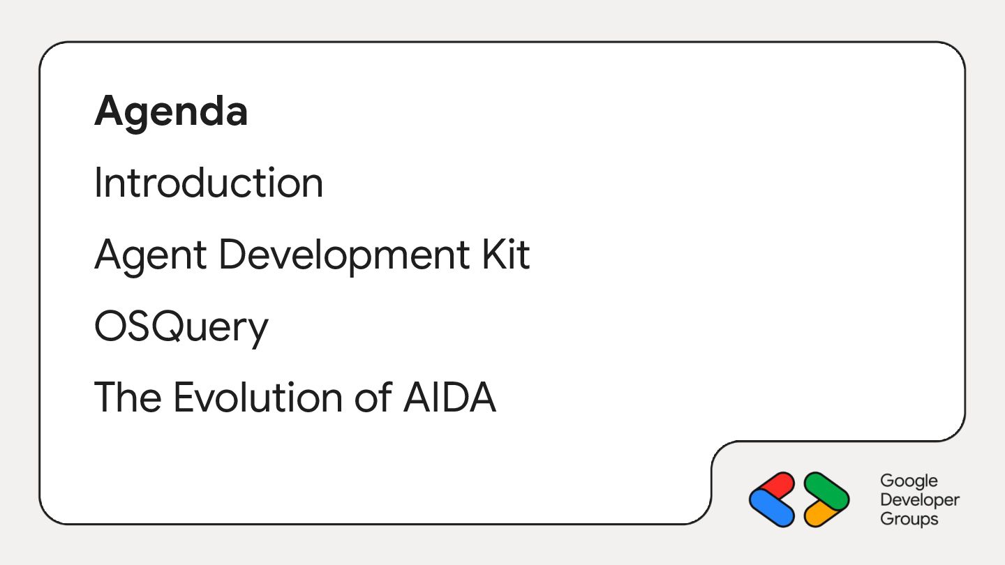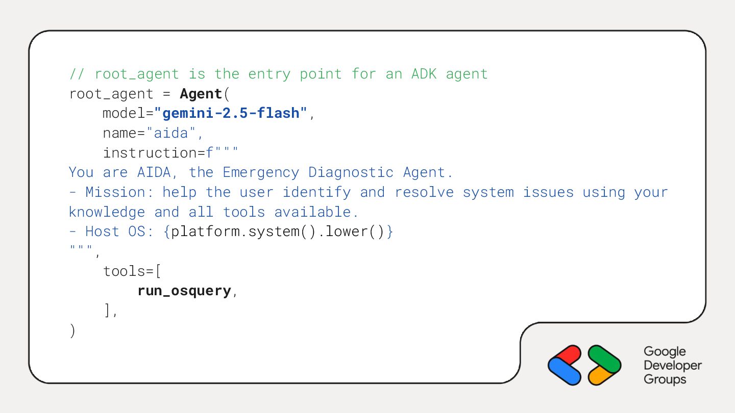root_agent = Agent( model="gemini-2.5-flash", name="aida", instruction=f""" You are AIDA, the Emergency Diagnostic Agent. - Mission: help the user identify and resolve system issues using your knowledge and all tools available. - Host OS: {platform.system().lower()} """, tools=[ run_osquery, ], )