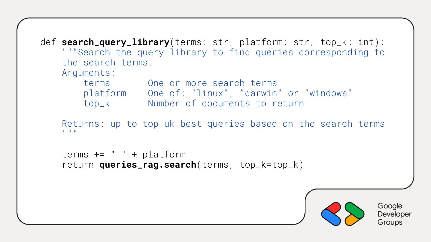 library to find queries corresponding to the search terms. Arguments: terms One or more search terms platform One of: "linux", "darwin" or "windows" top_k Number of documents to return Returns: up to top_uk best queries based on the search terms """ terms += " " + platform return queries_rag.search(terms, top_k=top_k)