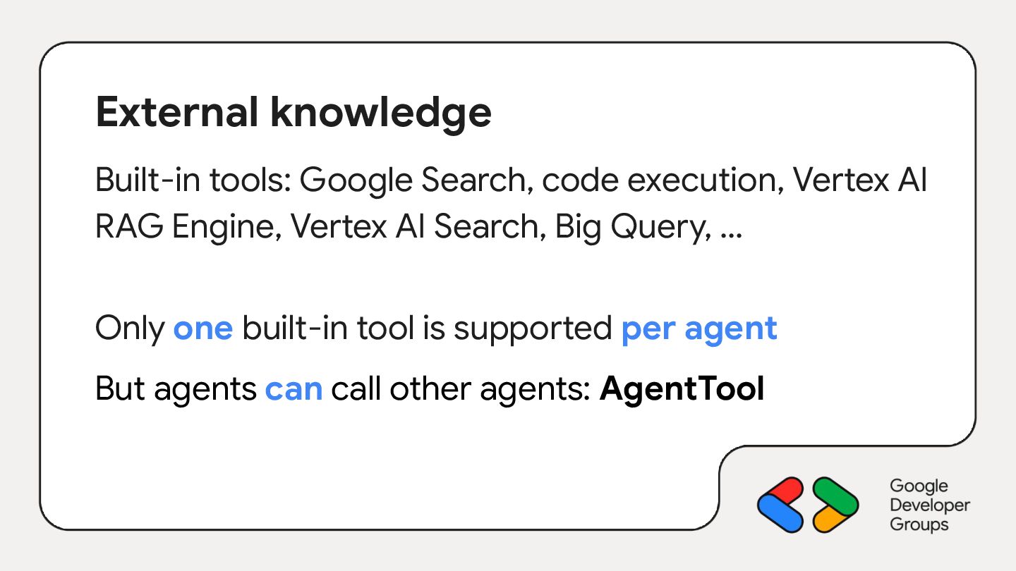 RAG Engine, Vertex AI Search, Big Query, … Only one built-in tool is supported per agent But agents can call other agents: AgentTool