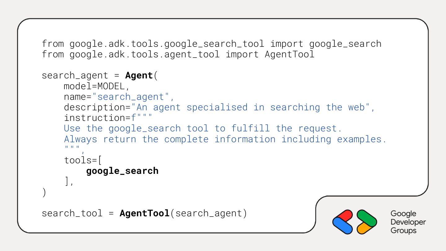 Agent( model=MODEL, name="search_agent", description="An agent specialised in searching the web", instruction=f""" Use the google_search tool to fulfill the request. Always return the complete information including examples. """, tools=[ google_search ], ) search_tool = AgentTool(search_agent)
