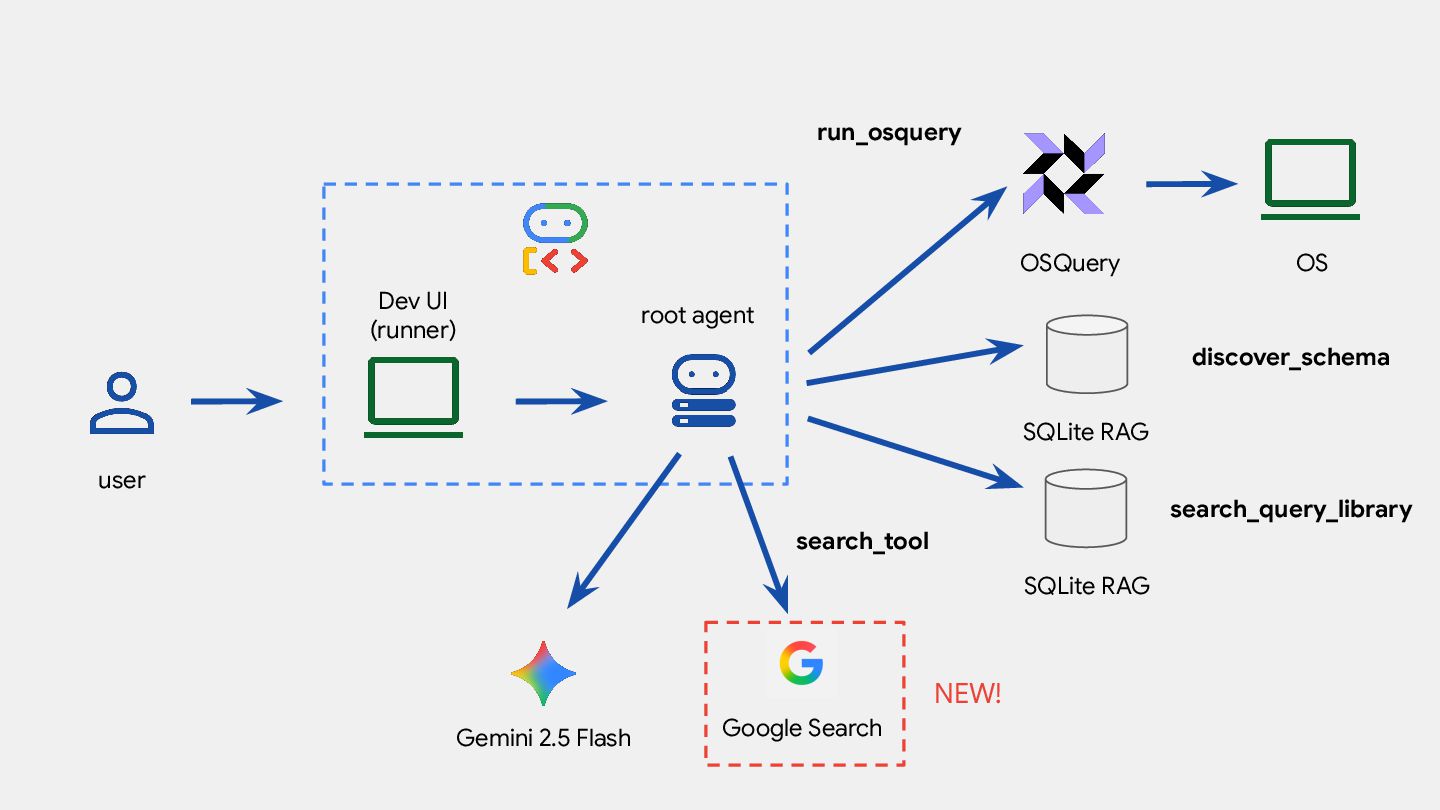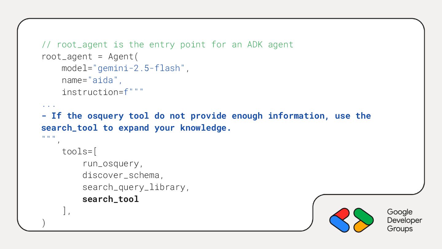 root_agent = Agent( model="gemini-2.5-flash", name="aida", instruction=f""" ... - If the osquery tool do not provide enough information, use the search_tool to expand your knowledge. """, tools=[ run_osquery, discover_schema, search_query_library, search_tool ], )