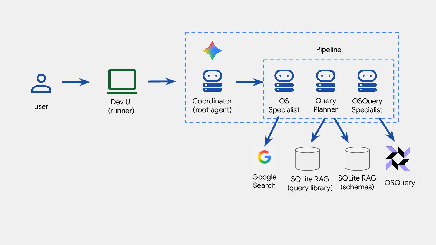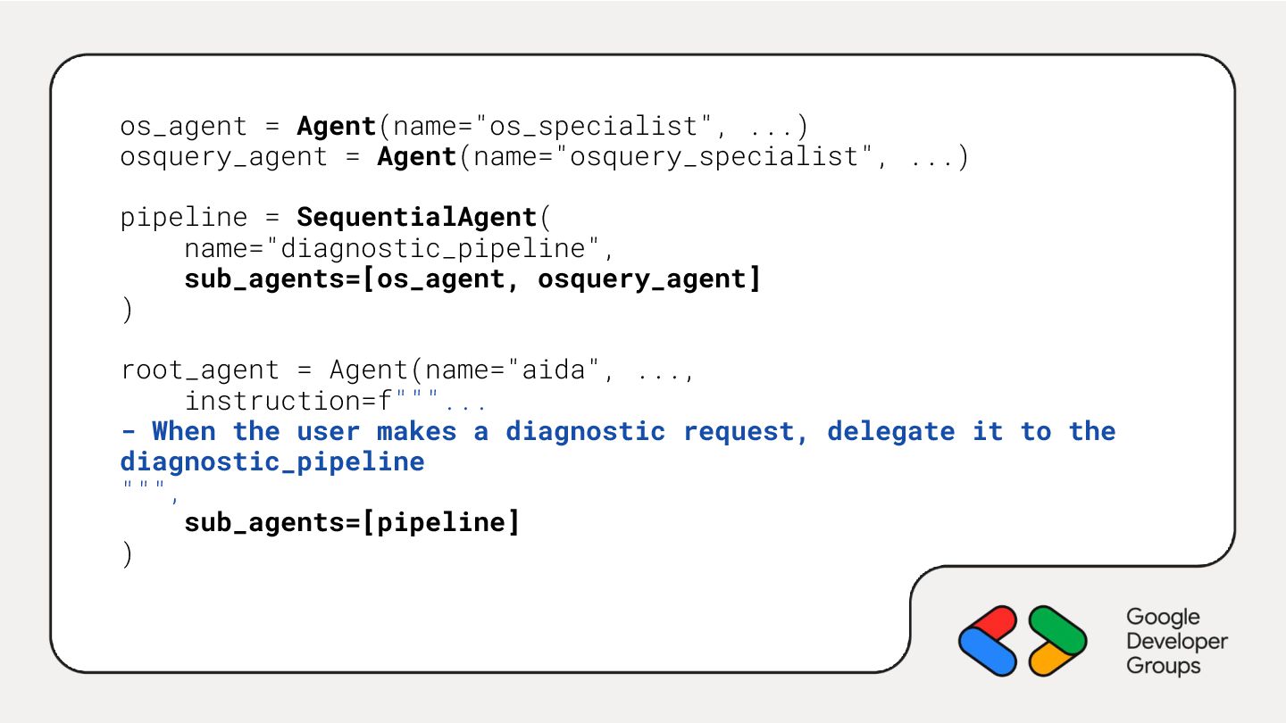 SequentialAgent( name="diagnostic_pipeline", sub_agents=[os_agent, osquery_agent] ) root_agent = Agent(name="aida", ..., instruction=f"""... - When the user makes a diagnostic request, delegate it to the diagnostic_pipeline """, sub_agents=[pipeline] )