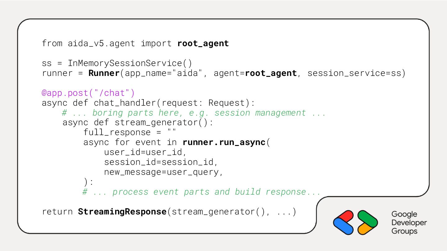 agent=root_agent, session_service=ss) @app.post("/chat") async def chat_handler(request: Request): # ... boring parts here, e.g. session management ... async def stream_generator(): full_response = "" async for event in runner.run_async( user_id=user_id, session_id=session_id, new_message=user_query, ): # ... process event parts and build response... return StreamingResponse(stream_generator(), ...)