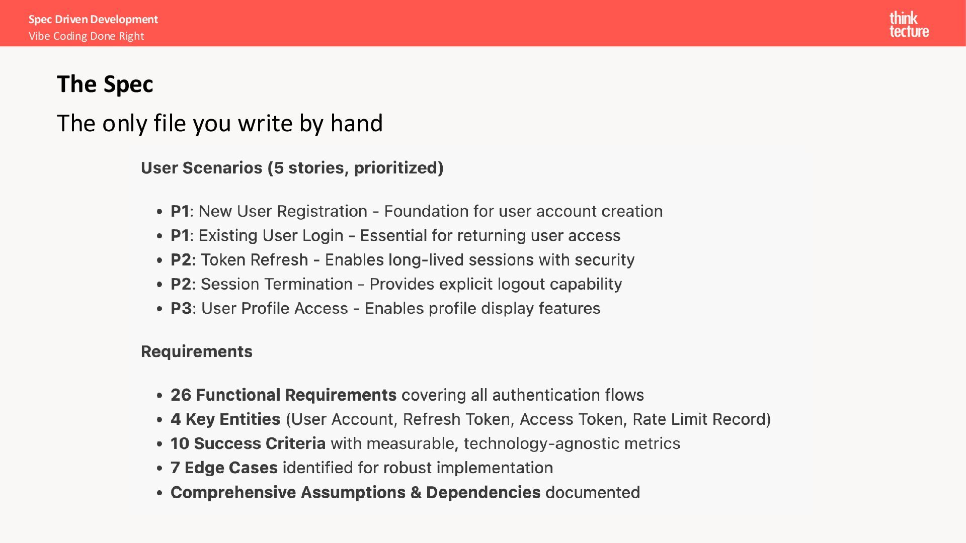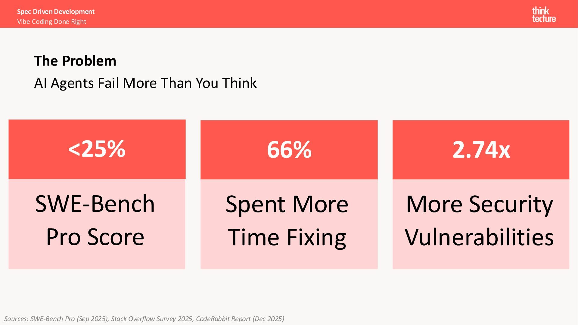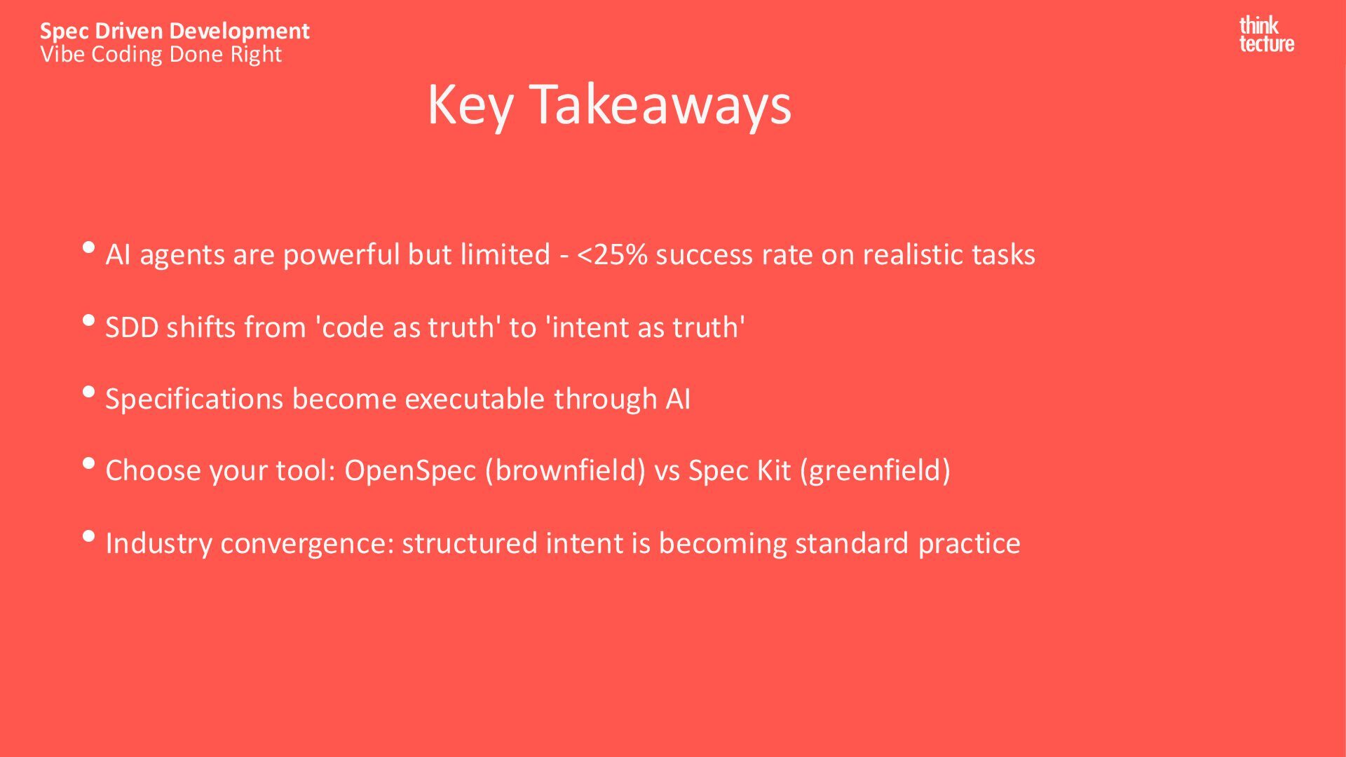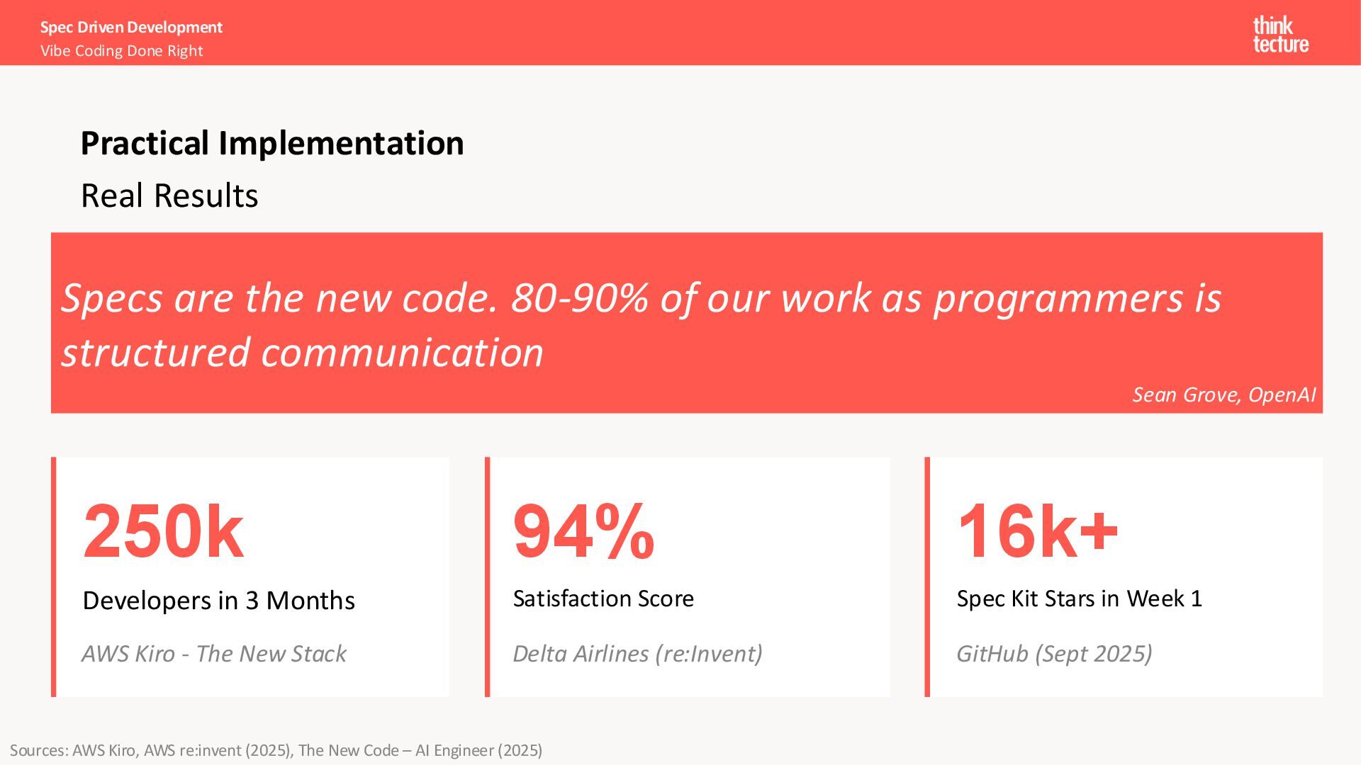 Implementation 250k Developers in 3 Months AWS Kiro - The New Stack 94% Satisfaction Score Delta Airlines (re:Invent) 16k+ Spec Kit Stars in Week 1 GitHub (Sept 2025) Specs are the new code. 80-90% of our work as programmers is structured communication Sean Grove, OpenAI Sources: AWS Kiro, AWS re:invent (2025), The New Code – AI Engineer (2025)