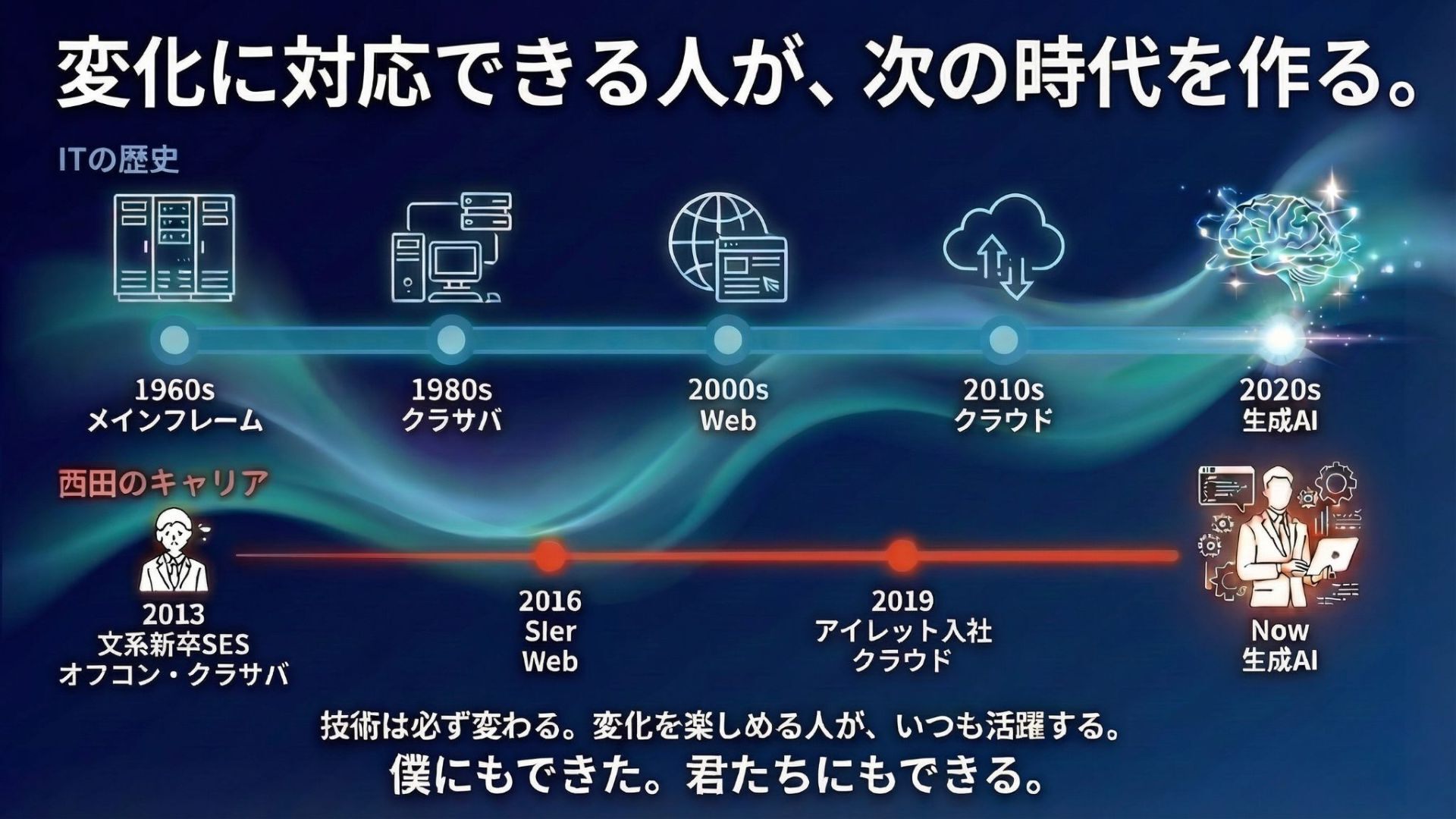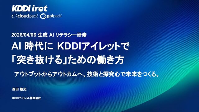 1. 西田 駿史 KDDIアイレット株式会社 AI 時代に KDDIアイレットで 「突き抜ける」ための働き方 2026/04/06 生成 AI