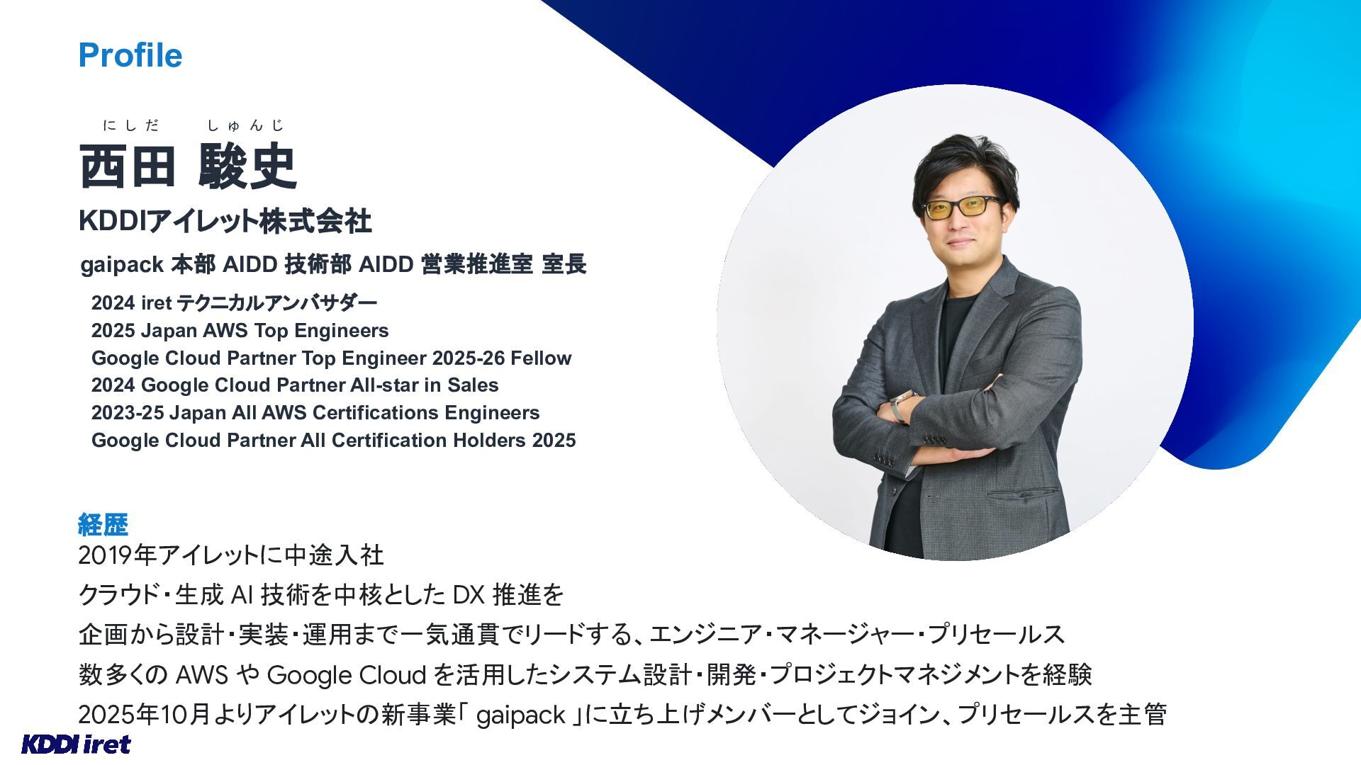 や Google Cloud を活用したシステム設計・開発・プロジェクトマネジメントを経験 2025年10月よりアイレットの新事業「 gaipack 」に立ち上げメンバーとしてジョイン、プリセールスを主管 西田 駿史 に し だ し ゅ ん じ 経歴 gaipack 本部 AIDD 技術部 AIDD 営業推進室 室長 2024 iret テクニカルアンバサダー 2025 Japan AWS Top Engineers Google Cloud Partner Top Engineer 2025-26 Fellow 2024 Google Cloud Partner All-star in Sales 2023-25 Japan All AWS Certifications Engineers Google Cloud Partner All Certification Holders 2025 KDDIアイレット株式会社