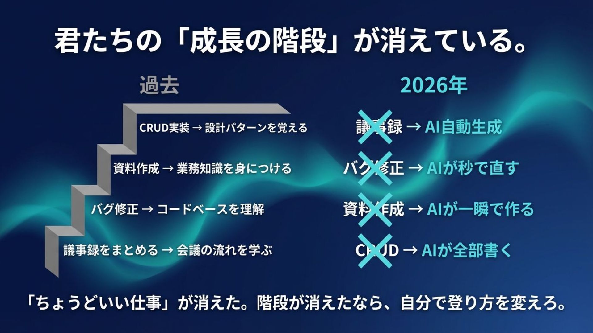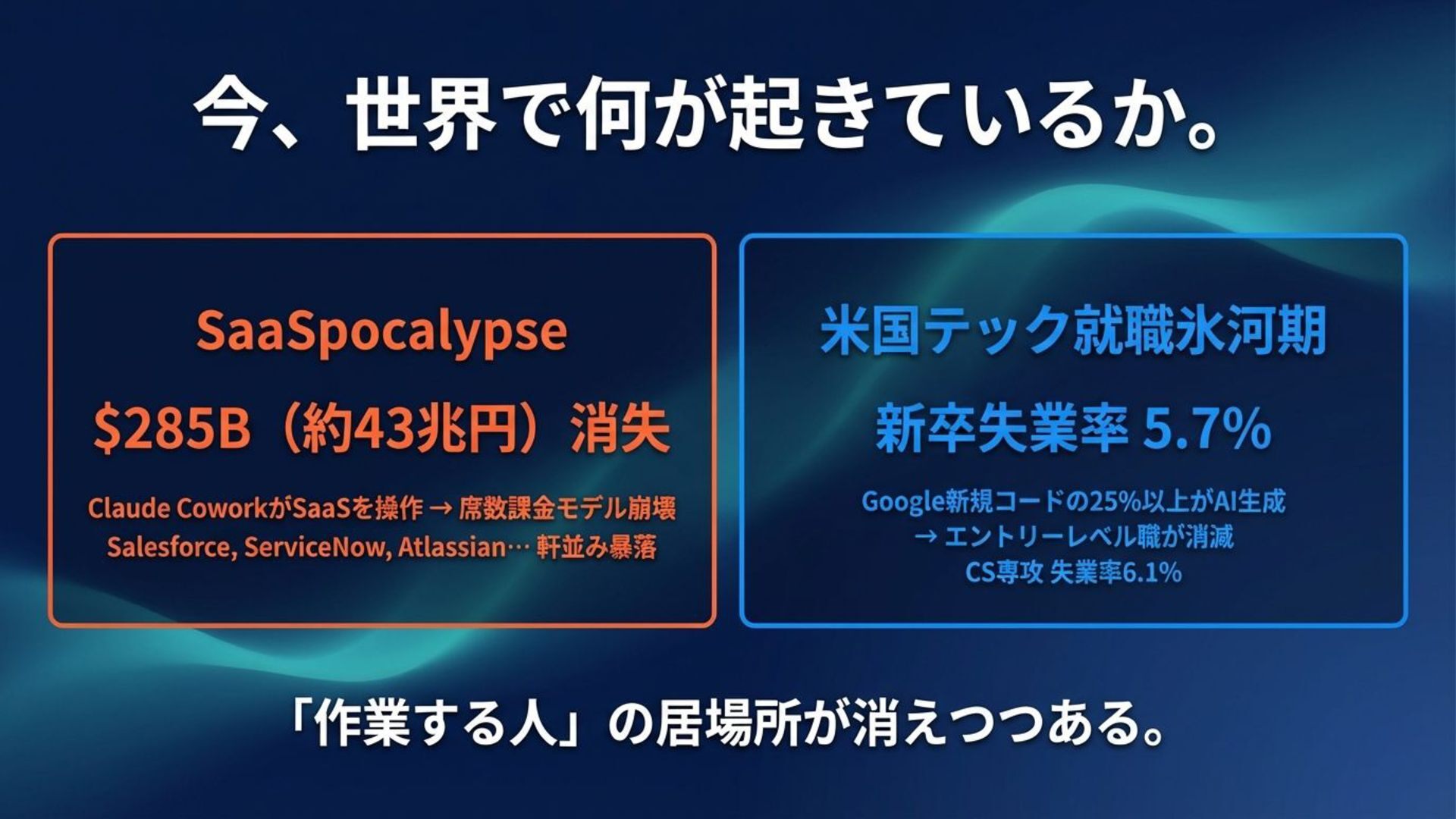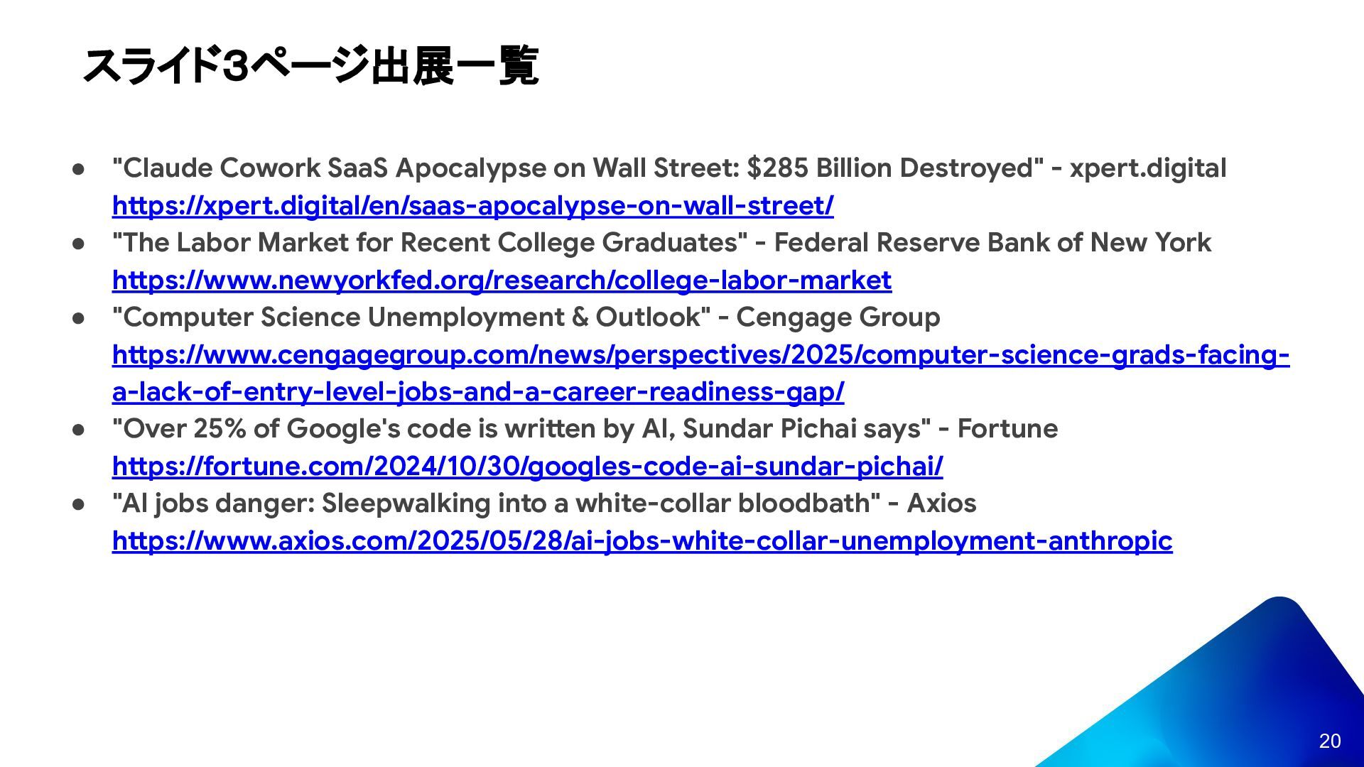 Destroyed" - xpert.digital https://xpert.digital/en/saas-apocalypse-on-wall-street/ • "The Labor Market for Recent College Graduates" - Federal Reserve Bank of New York https://www.newyorkfed.org/research/college-labor-market • "Computer Science Unemployment & Outlook" - Cengage Group https://www.cengagegroup.com/news/perspectives/2025/computer-science-grads-facing- a-lack-of-entry-level-jobs-and-a-career-readiness-gap/ • "Over 25% of Google's code is written by AI, Sundar Pichai says" - Fortune https://fortune.com/2024/10/30/googles-code-ai-sundar-pichai/ • "AI jobs danger: Sleepwalking into a white-collar bloodbath" - Axios https://www.axios.com/2025/05/28/ai-jobs-white-collar-unemployment-anthropic 20 スライド3ページ出展一覧