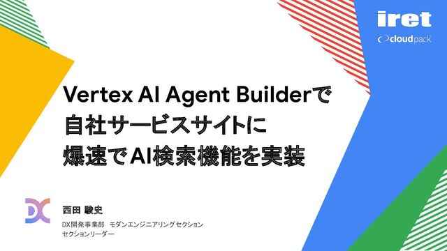 西田 駿史 Vertex AI Agent Builderで 自社サービスサイトに 爆速でAI検索機能を実装 DX開発事業部 モダンエンジニアリングセクション セクションリーダー