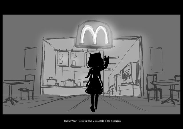 Shelly and Otter search for the entrance to the government bomb activation room hidden inside the McDonalds in the Pentagon in order to execute Otter's plan to blow up the Earth.