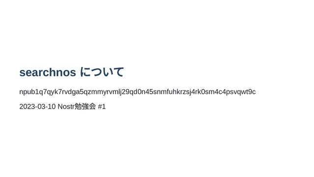 searchnos について npub1q7qyk7rvdga5qzmmyrvmlj29qd0n45snmfuhkrzsj4rk0sm4c4psvqwt9c 2023-03-10 Nostr 勉強会 #1