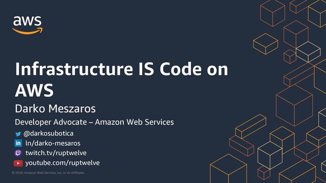 In the age of The Cloud, Serverless, Containers and Microservices, our infrastructure is part of our application more than ever. So why do we still treat it as something else? Our Application is Code, our Business Logic is code, well Infrastructure also IS code. One of the parts of doing things properly at scale is being able to describe your infrastructure as code and deploy it as such. If we already treat our infrastructure as code, why not apply all the best practices of software delivery to infrastructure delivery. In this session we look into Infrastructure as Code solutions, best practices and patterns on AWS.