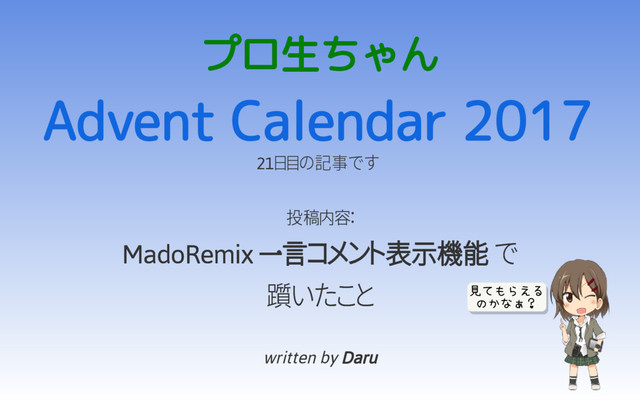 プロ生ちゃんAdvent Calendar 2017 21日目の投稿記事です MadoRemixのマスコット一言コメント表示機能で躓いたことを書いてみたものです