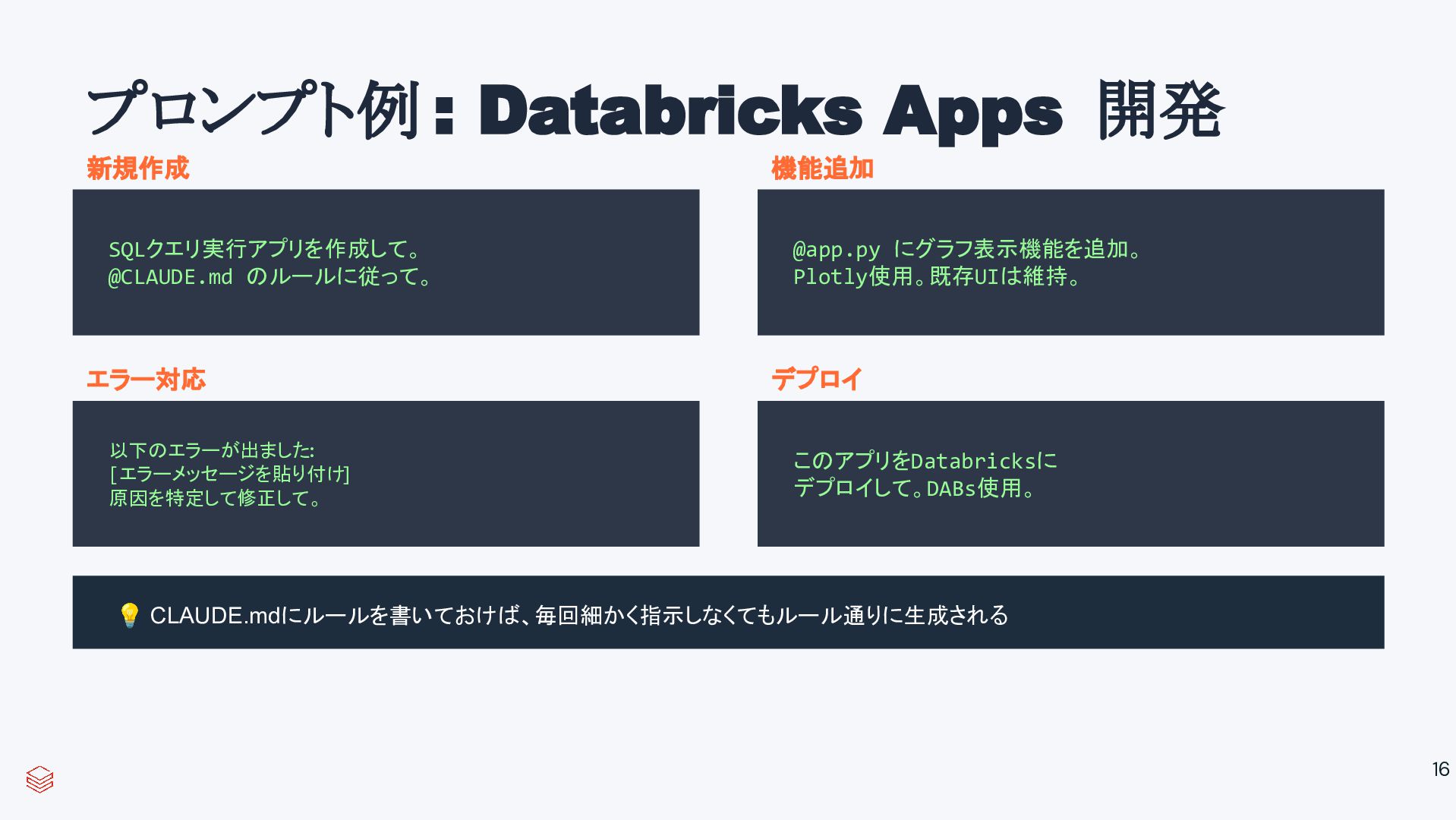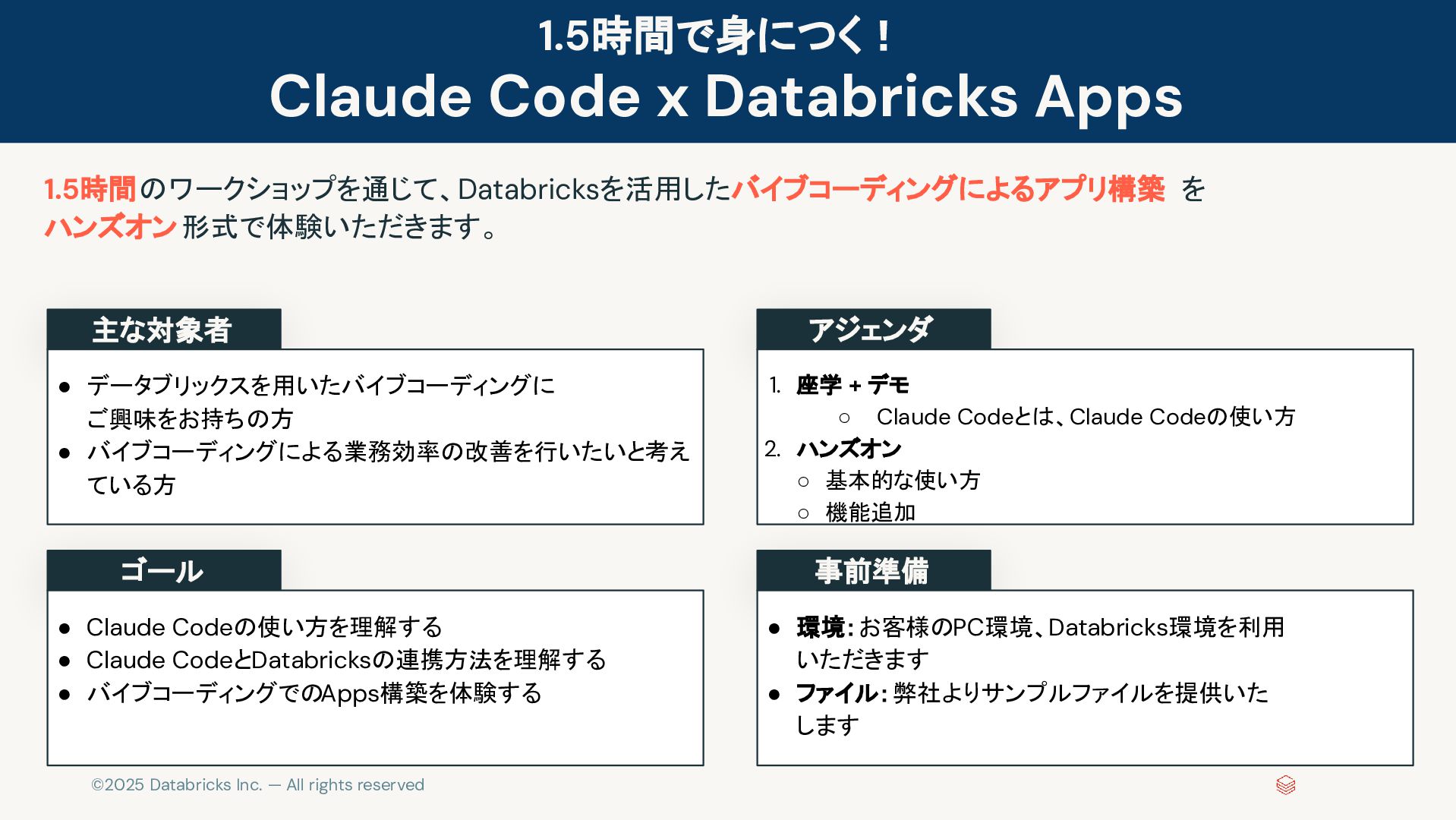x Databricks Apps 主な対象者 1.5時間のワークショップを通じて、Databricksを活用したバイブコーディングによるアプリ構築 を ハンズオン 形式で体験いただきます。 • データブリックスを用いたバイブコーディングに ご興味をお持ちの方 • バイブコーディングによる業務効率の改善を行いたいと考え ている方 ゴール 事前準備 アジェンダ 1. 座学 + デモ ◦ Claude Codeとは、Claude Codeの使い方 2. ハンズオン ◦ 基本的な使い方 ◦ 機能追加 • Claude Codeの使い方を理解する • Claude CodeとDatabricksの連携方法を理解する • バイブコーディングでのApps構築を体験する • 環境:お客様のPC環境、Databricks環境を利用 いただきます • ファイル:弊社よりサンプルファイルを提供いた します