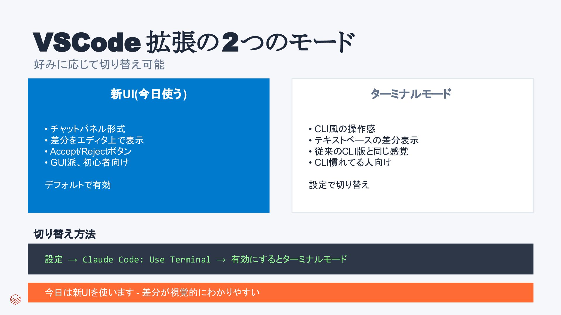 • GUI派、初心者向け デフォルトで有効 ターミナルモード • CLI風の操作感 • テキストベースの差分表示 • 従来のCLI版と同じ感覚 • CLI慣れてる人向け 設定で切り替え 切り替え方法 設定 → Claude Code: Use Terminal → 有効にするとターミナルモード 今日は新UIを使います - 差分が視覚的にわかりやすい