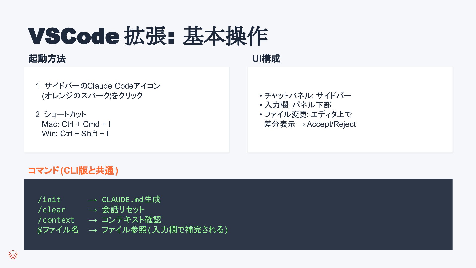 Mac: Ctrl + Cmd + I Win: Ctrl + Shift + I UI構成 • チャットパネル: サイドバー • 入力欄: パネル下部 • ファイル変更: エディタ上で 差分表示 → Accept/Reject コマンド(CLI版と共通) /init → CLAUDE.md生成 /clear → 会話リセット /context → コンテキスト確認 @ファイル名 → ファイル参照(入力欄で補完される)