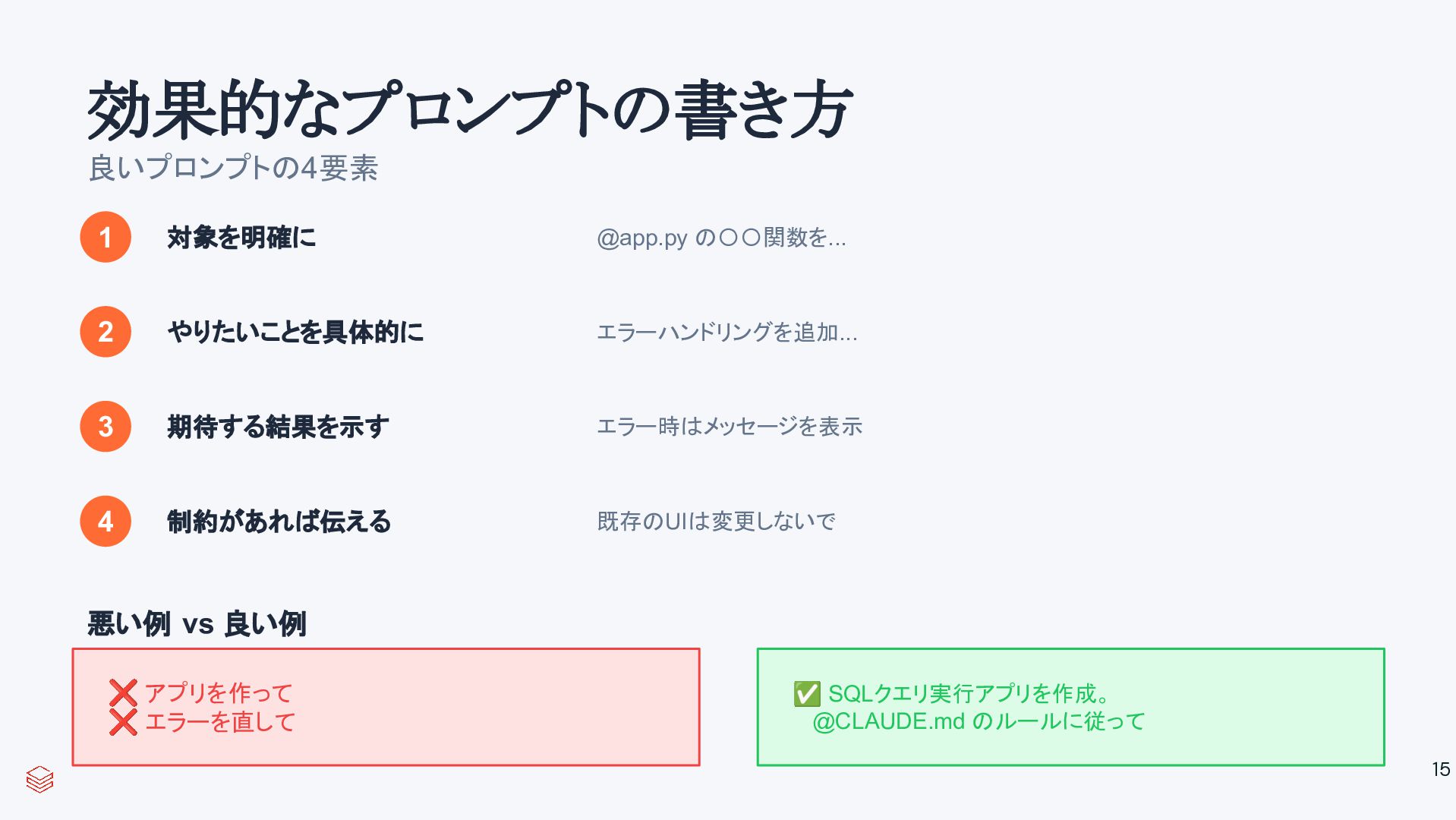 期待する結果を示す エラー時はメッセージを表示 4 制約があれば伝える 既存のUIは変更しないで 悪い例 vs 良い例 ❌ アプリを作って ❌ エラーを直して ✅ SQLクエリ実行アプリを作成。 @CLAUDE.md のルールに従って 15