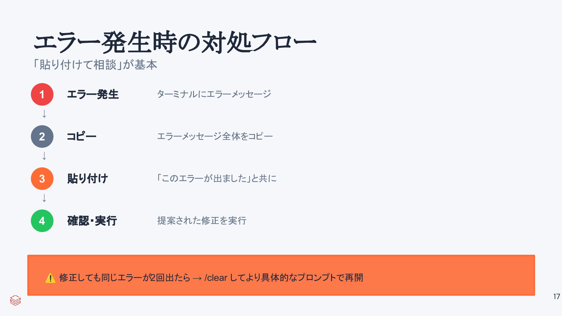 エラー発生時の対処フロー 「貼り付けて相談」が基本 1 エラー発生 ターミナルにエラーメッセージ ↓ 2 コピー エラーメッセージ全体をコピー ↓