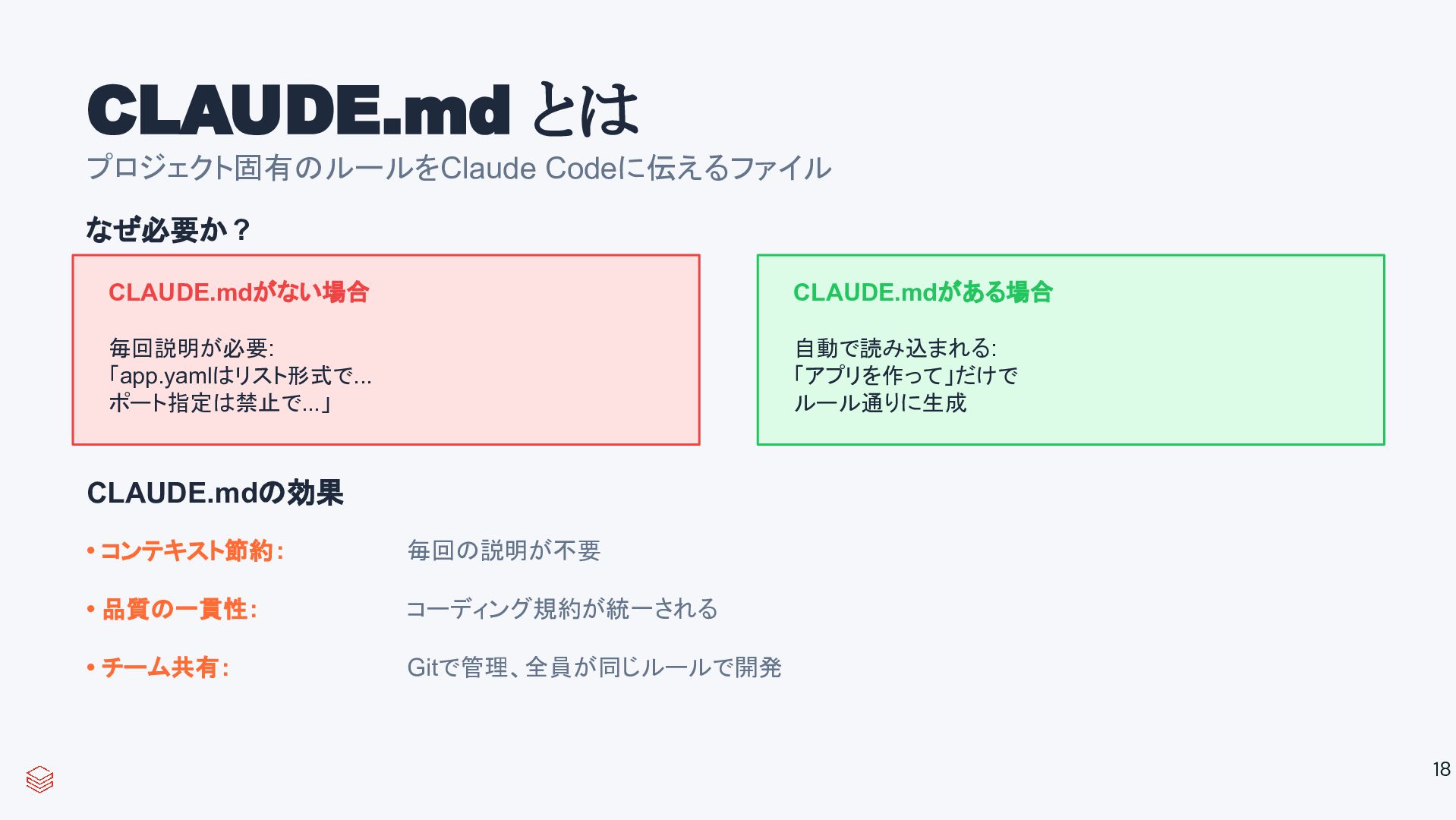 CLAUDE.md とは プロジェクト固有のルールをClaude Codeに伝えるファイル なぜ必要か ? CLAUDE.mdがない場合 毎回説明が必要: 「app.yamlはリスト形式で... ポート指定は禁止で...」