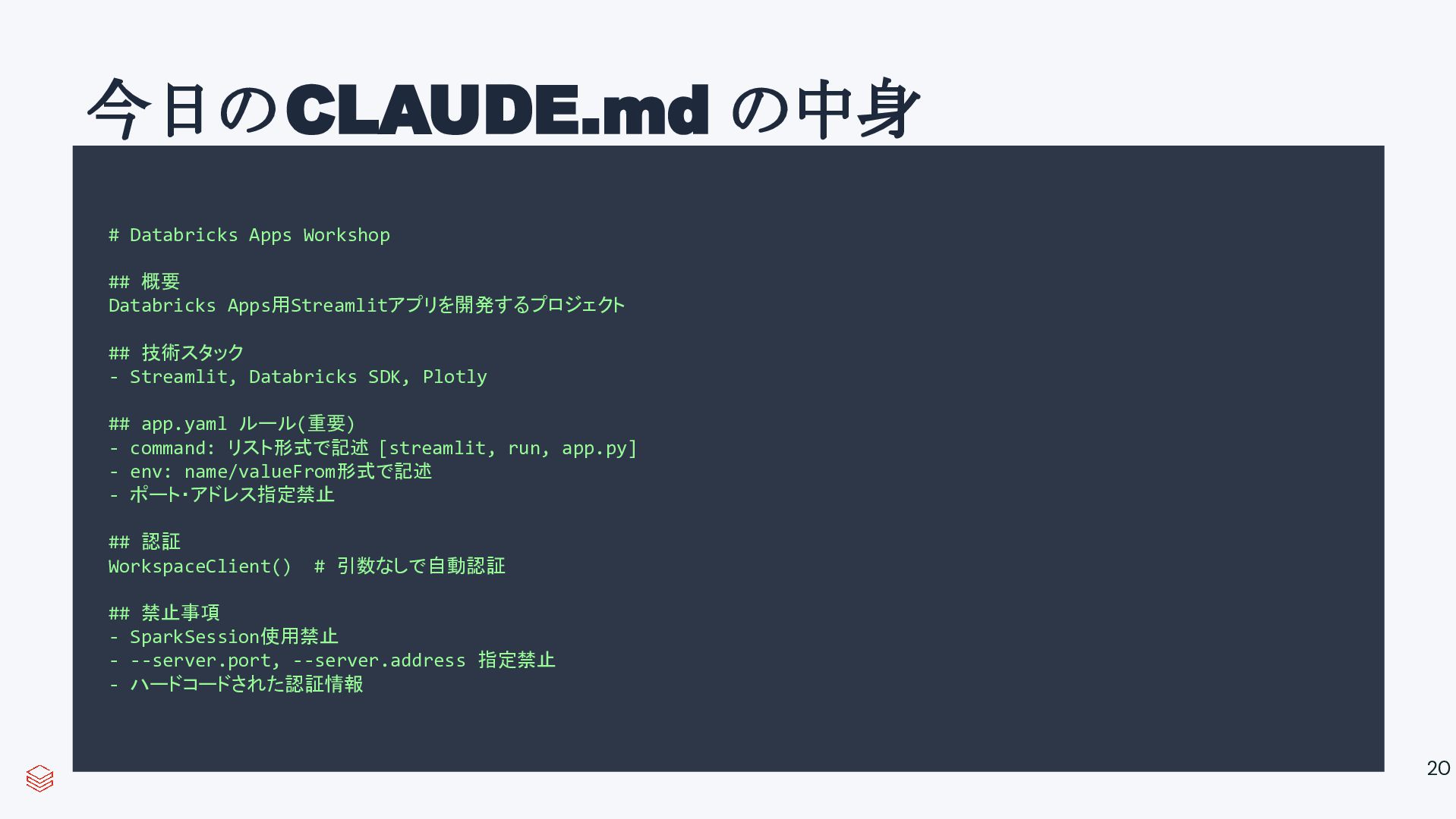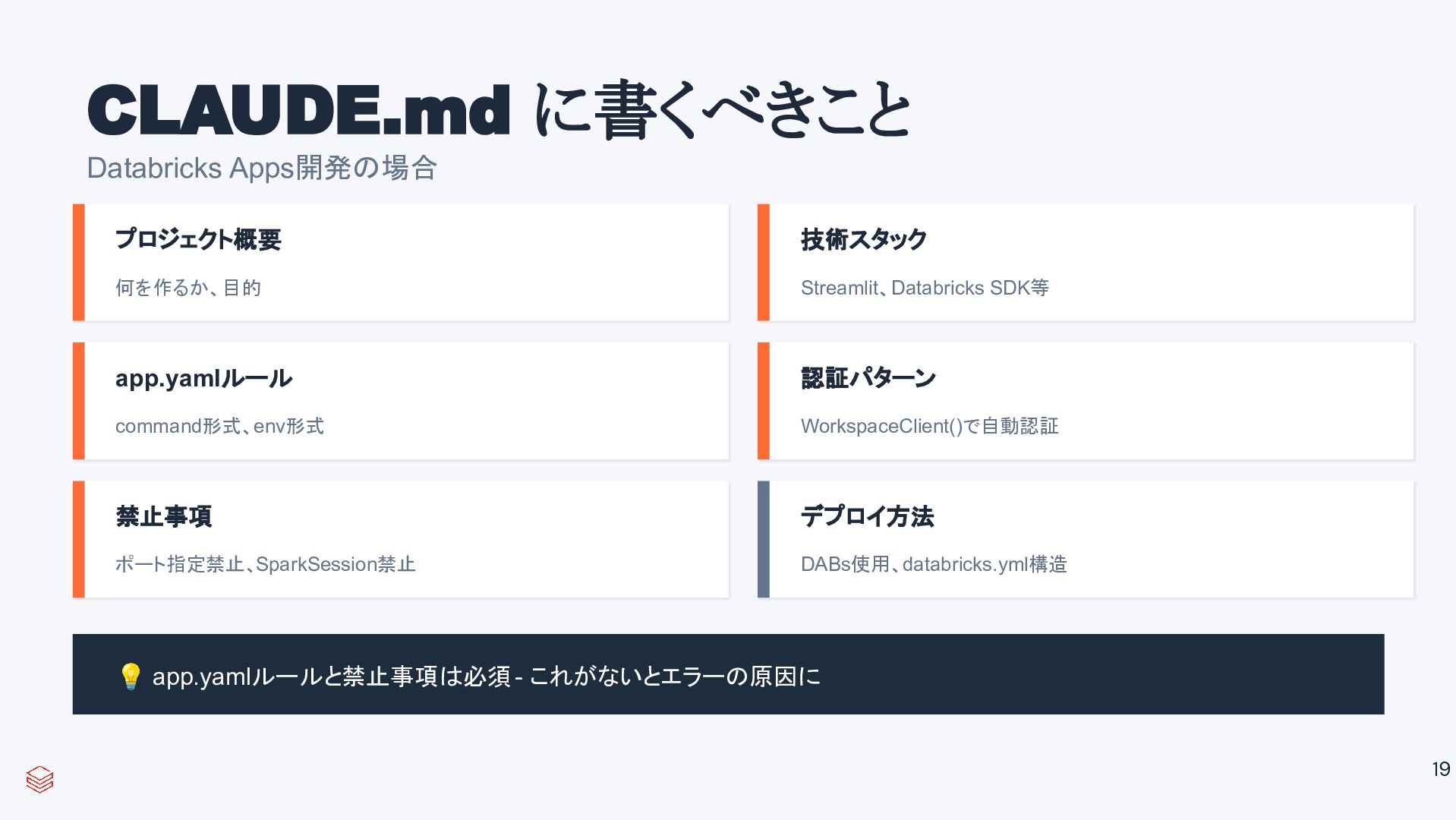 CLAUDE.md に書くべきこと Databricks Apps開発の場合 プロジェクト概要 何を作るか、目的 技術スタック Streamlit、Databricks SDK等 app.yamlルール