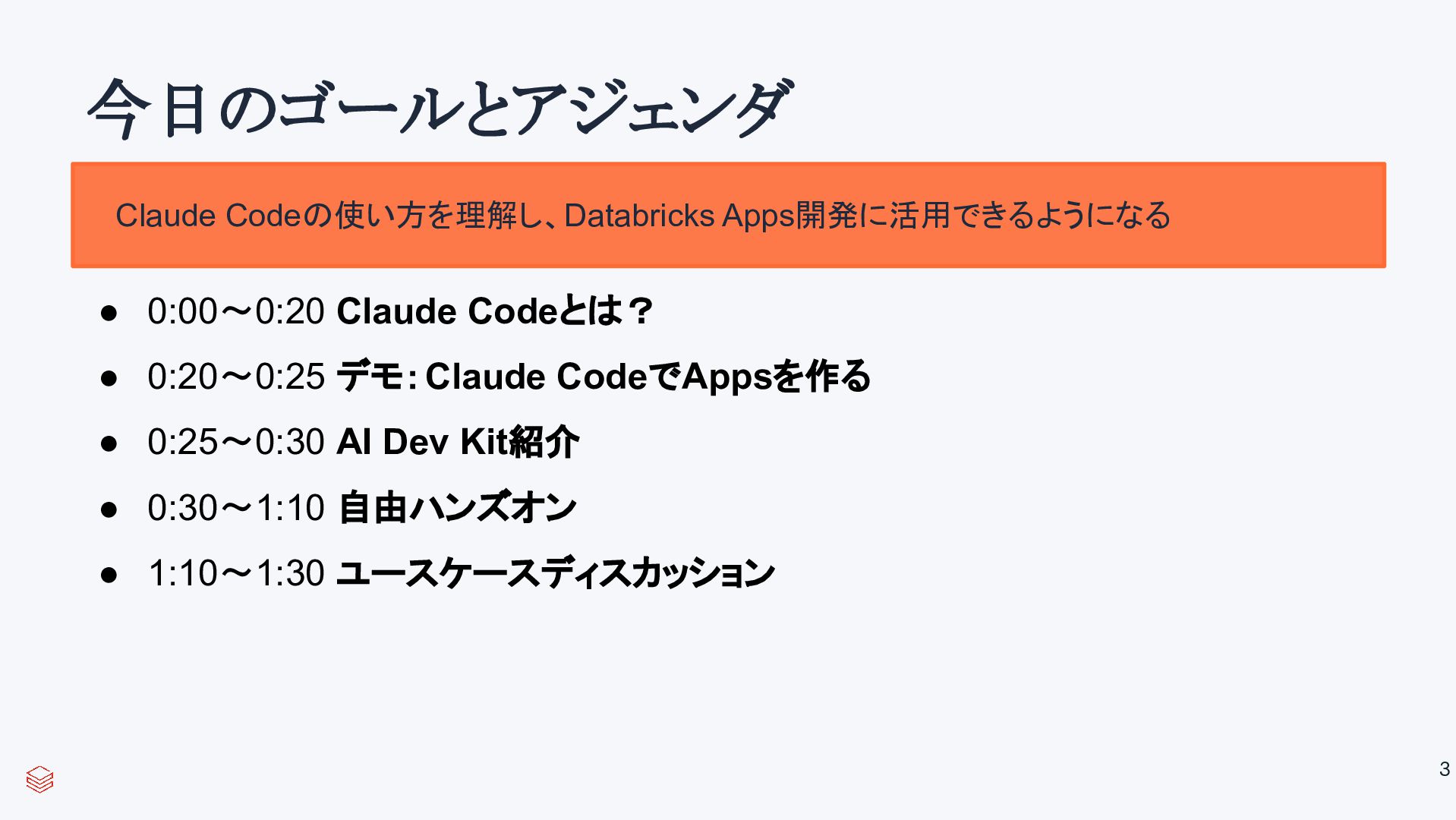0:20〜0:25 デモ:Claude CodeでAppsを作る • 0:25〜0:30 AI Dev Kit紹介 • 0:30〜1:10 自由ハンズオン • 1:10〜1:30 ユースケースディスカッション