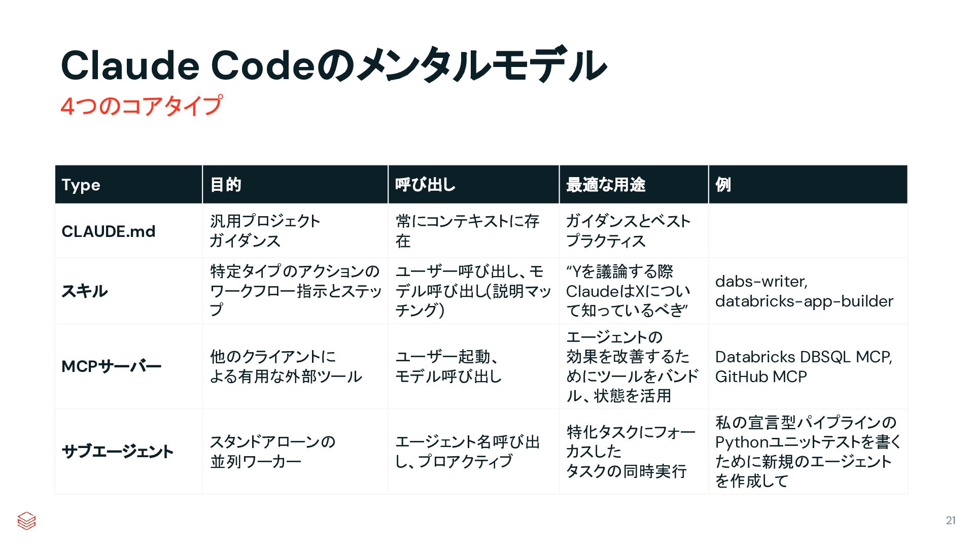 ガイダンス 常にコンテキストに存 在 ガイダンスとベスト プラクティス スキル 特定タイプのアクションの ワークフロー指示とステッ プ ユーザー呼び出し、モ デル呼び出し(説明マッ チング) “Yを議論する際 ClaudeはXについ て知っているべき” dabs-writer, databricks-app-builder MCPサーバー 他のクライアントに よる有用な外部ツール ユーザー起動、 モデル呼び出し エージェントの 効果を改善するた めにツールをバンド ル、状態を活用 Databricks DBSQL MCP, GitHub MCP サブエージェント スタンドアローンの 並列ワーカー エージェント名呼び出 し、プロアクティブ 特化タスクにフォー カスした タスクの同時実行 私の宣言型パイプラインの Pythonユニットテストを書く ために新規のエージェント を作成して 4つのコアタイプ