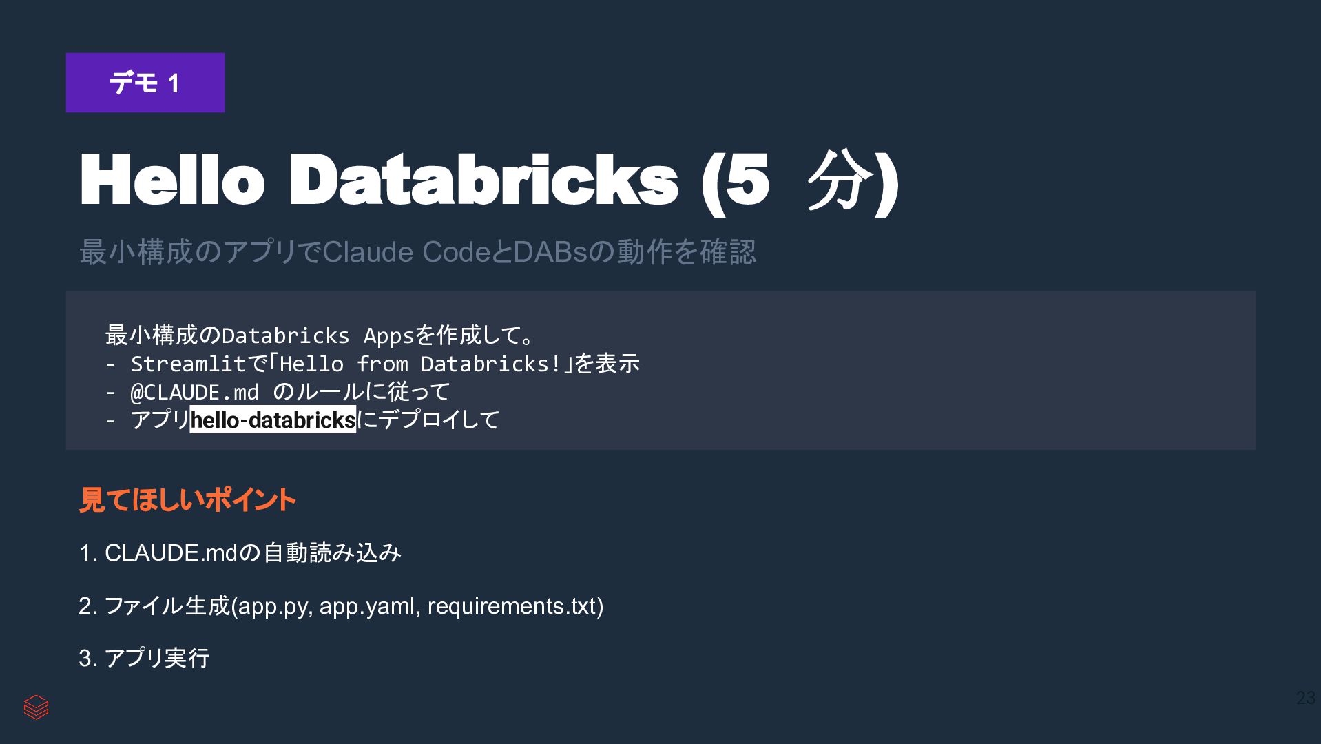 - Streamlitで「Hello from Databricks!」を表示 - @CLAUDE.md のルールに従って - アプリhello-databricksにデプロイして 見てほしいポイント 1. CLAUDE.mdの自動読み込み 2. ファイル生成(app.py, app.yaml, requirements.txt) 3. アプリ実行 23