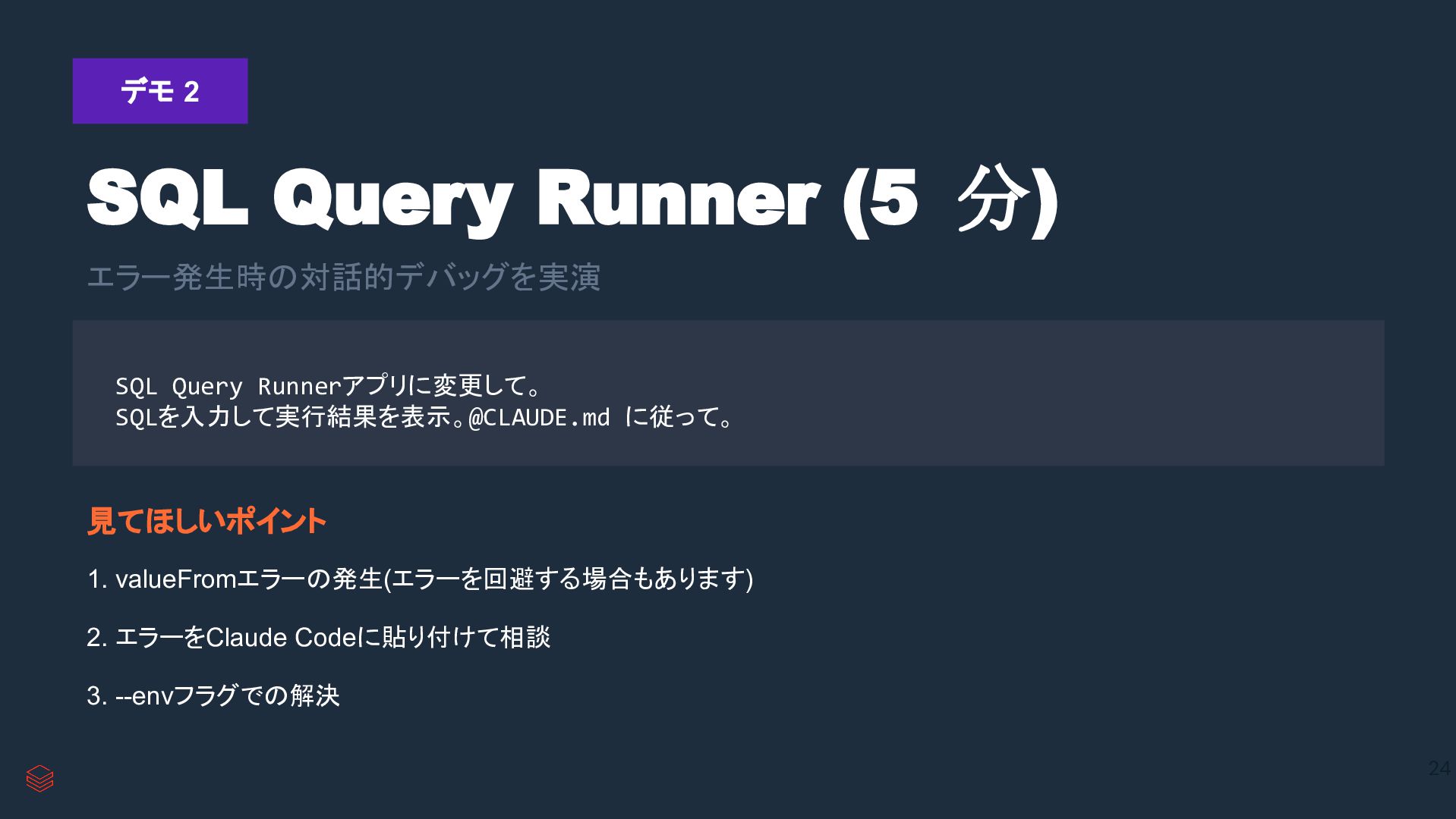 Runnerアプリに変更して。 SQLを入力して実行結果を表示。@CLAUDE.md に従って。 見てほしいポイント 1. valueFromエラーの発生(エラーを回避する場合もあります) 2. エラーをClaude Codeに貼り付けて相談 3. --envフラグでの解決 24