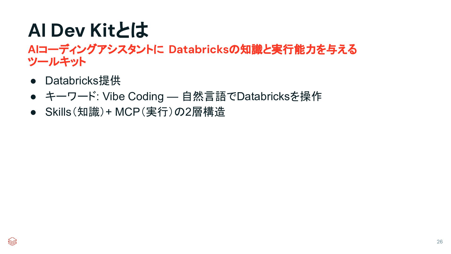 MCP(実行)の2層構造 AI Dev Kitとは AIコーディングアシスタントに Databricksの知識と実行能力を与える ツールキット 26