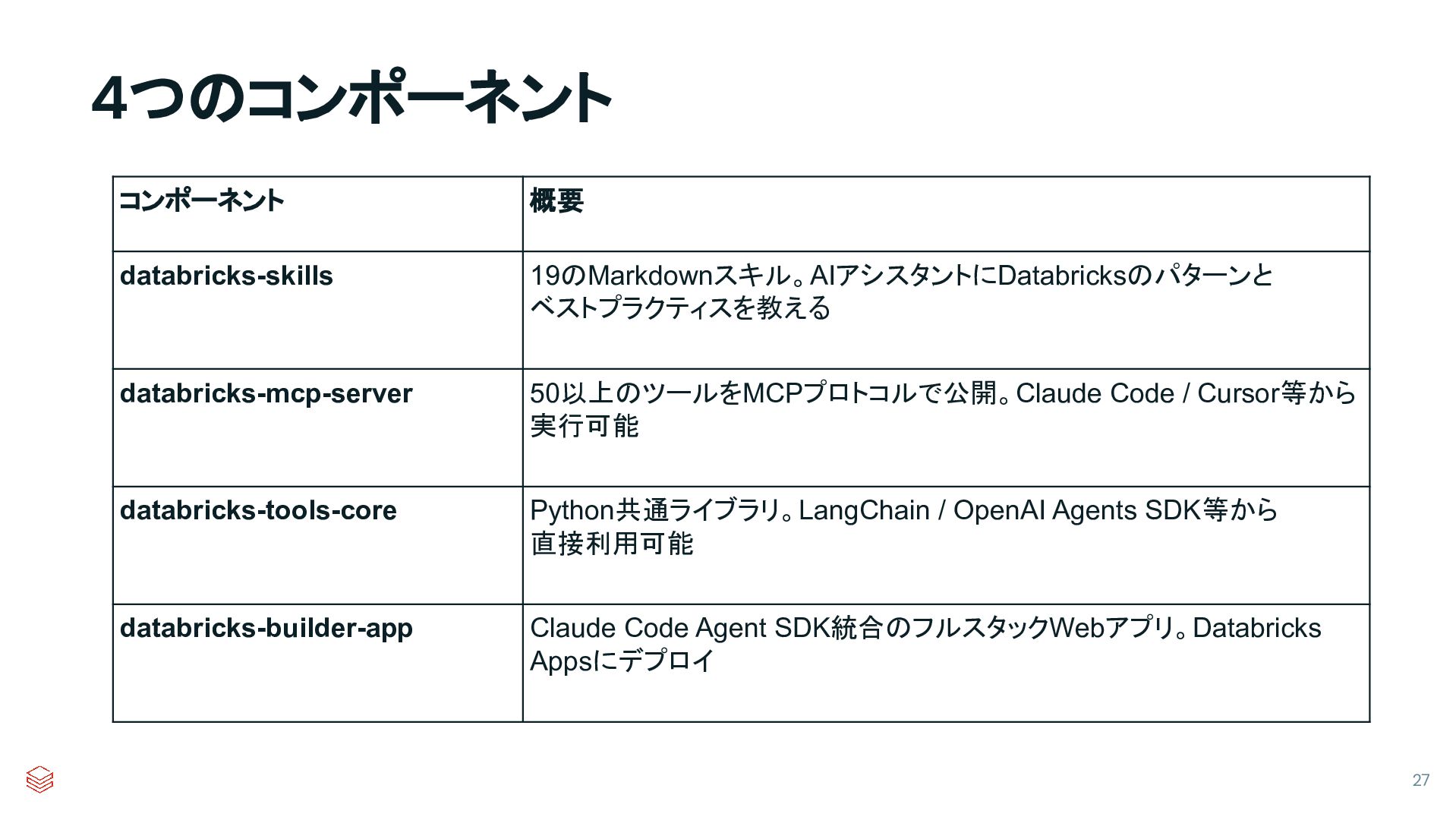 Cursor等から 実行可能 databricks-tools-core Python共通ライブラリ。LangChain / OpenAI Agents SDK等から 直接利用可能 databricks-builder-app Claude Code Agent SDK統合のフルスタックWebアプリ。Databricks Appsにデプロイ 27