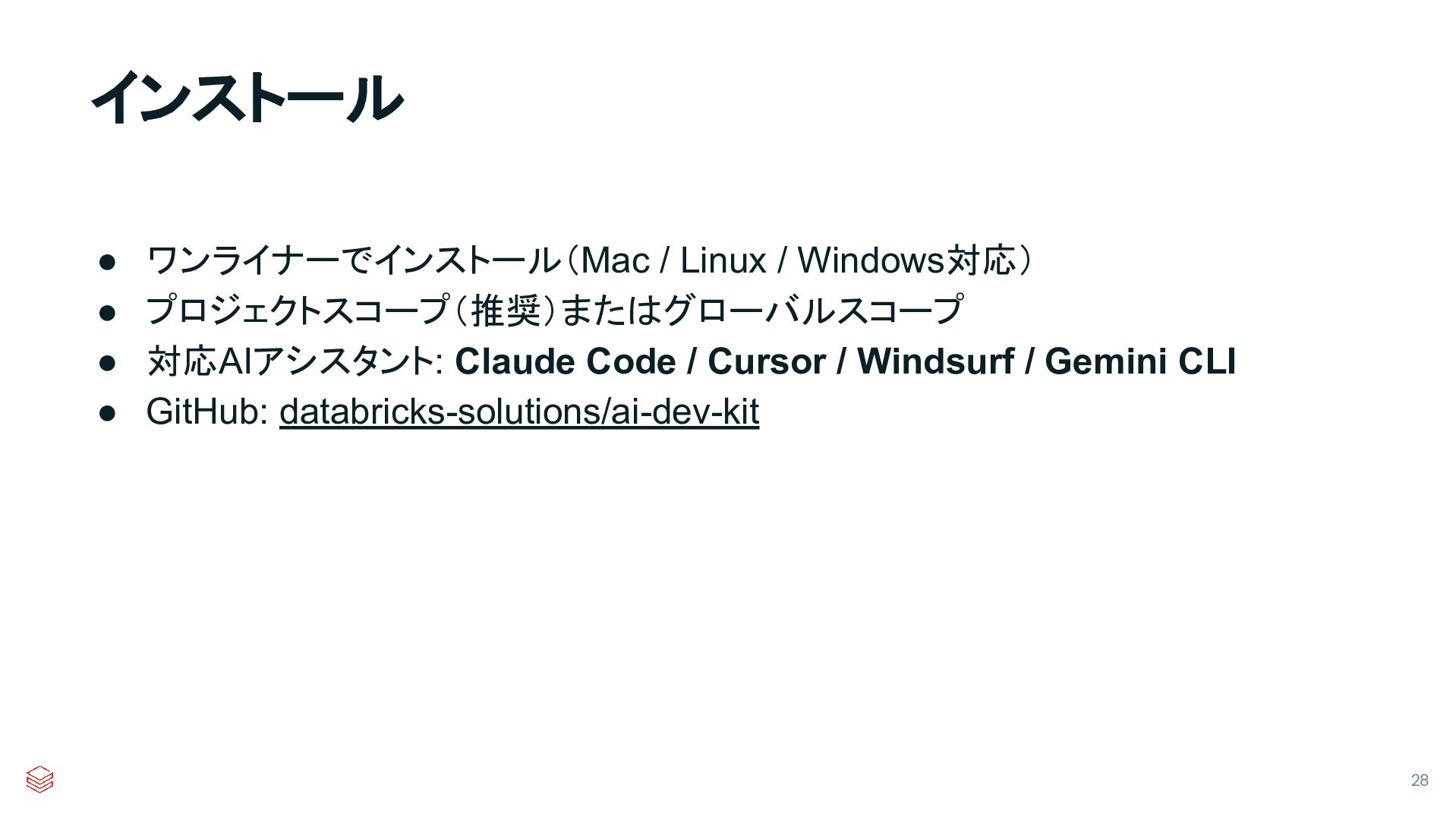 Claude Code / Cursor / Windsurf / Gemini CLI • GitHub: databricks-solutions/ai-dev-kit インストール 28