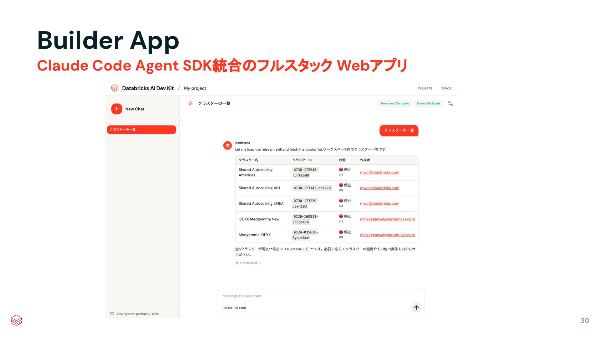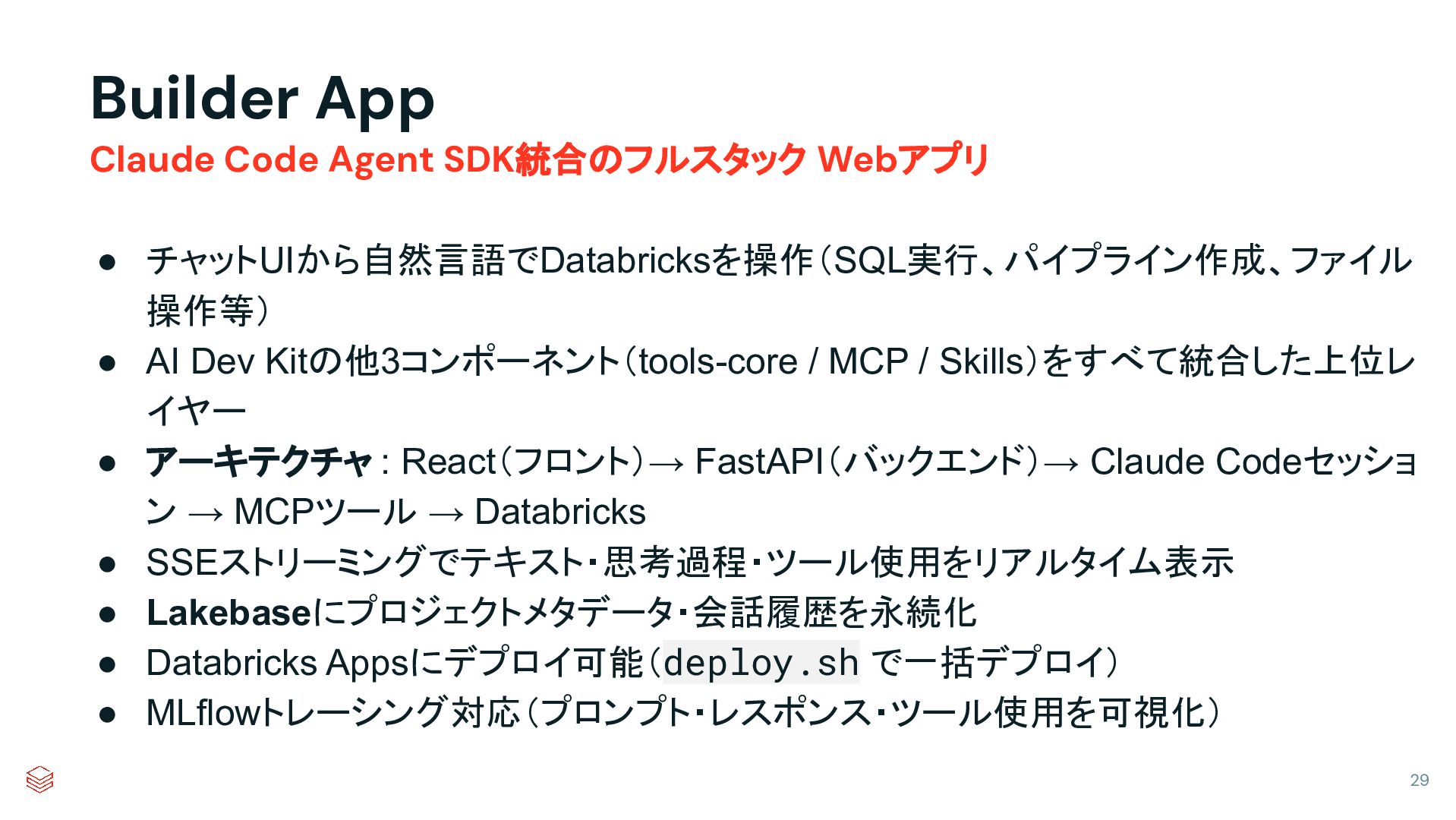 Skills)をすべて統合した上位レ イヤー • アーキテクチャ : React(フロント)→ FastAPI(バックエンド)→ Claude Codeセッショ ン → MCPツール → Databricks • SSEストリーミングでテキスト・思考過程・ツール使用をリアルタイム表示 • Lakebaseにプロジェクトメタデータ・会話履歴を永続化 • Databricks Appsにデプロイ可能(deploy.sh で一括デプロイ) • MLflowトレーシング対応(プロンプト・レスポンス・ツール使用を可視化) Builder App Claude Code Agent SDK統合のフルスタック Webアプリ 29