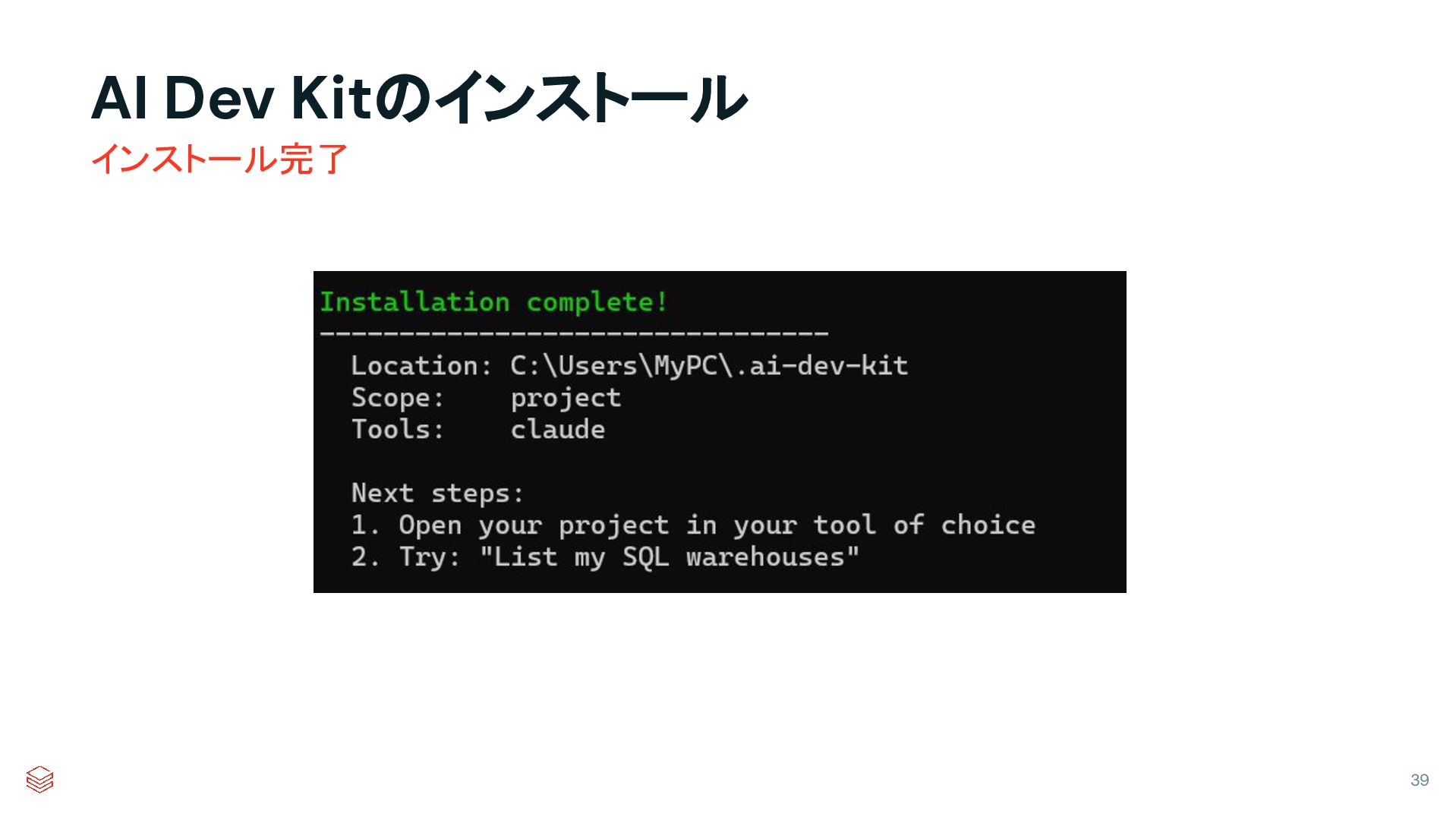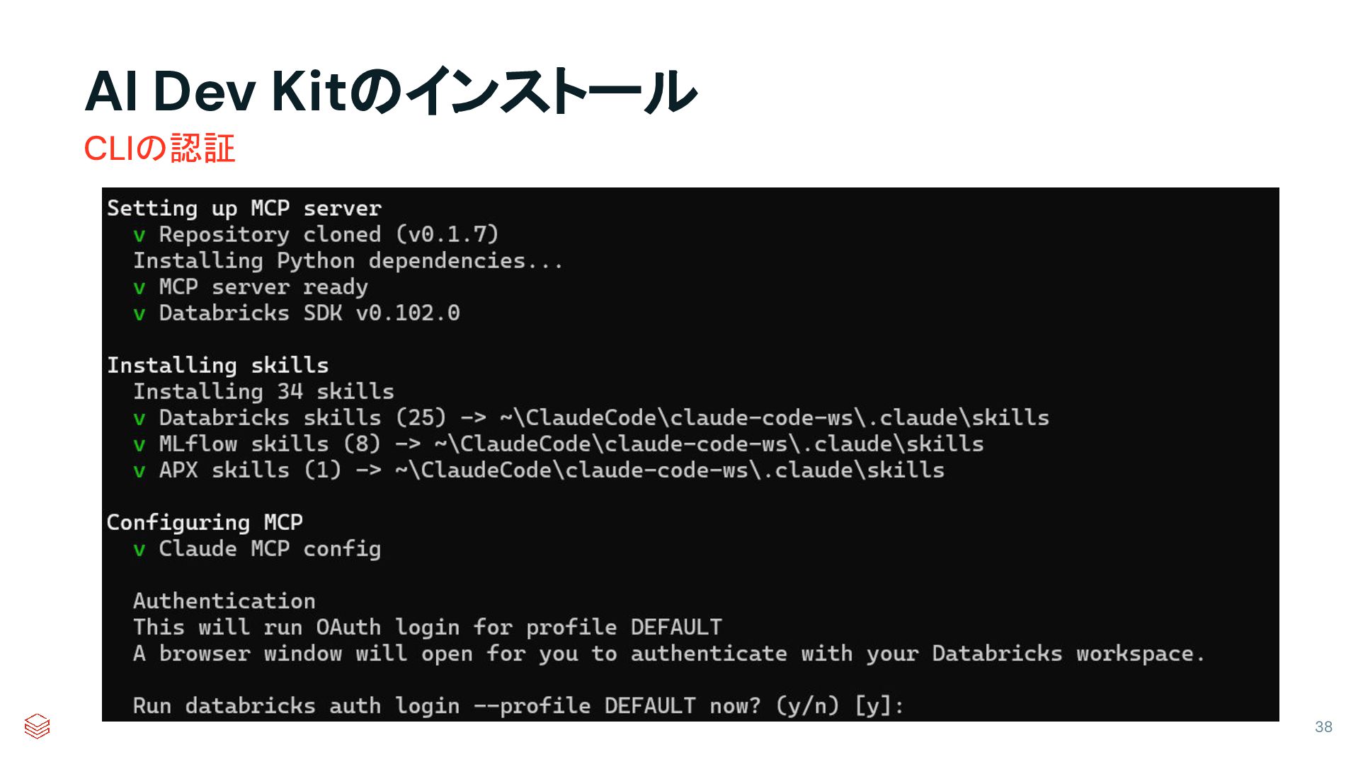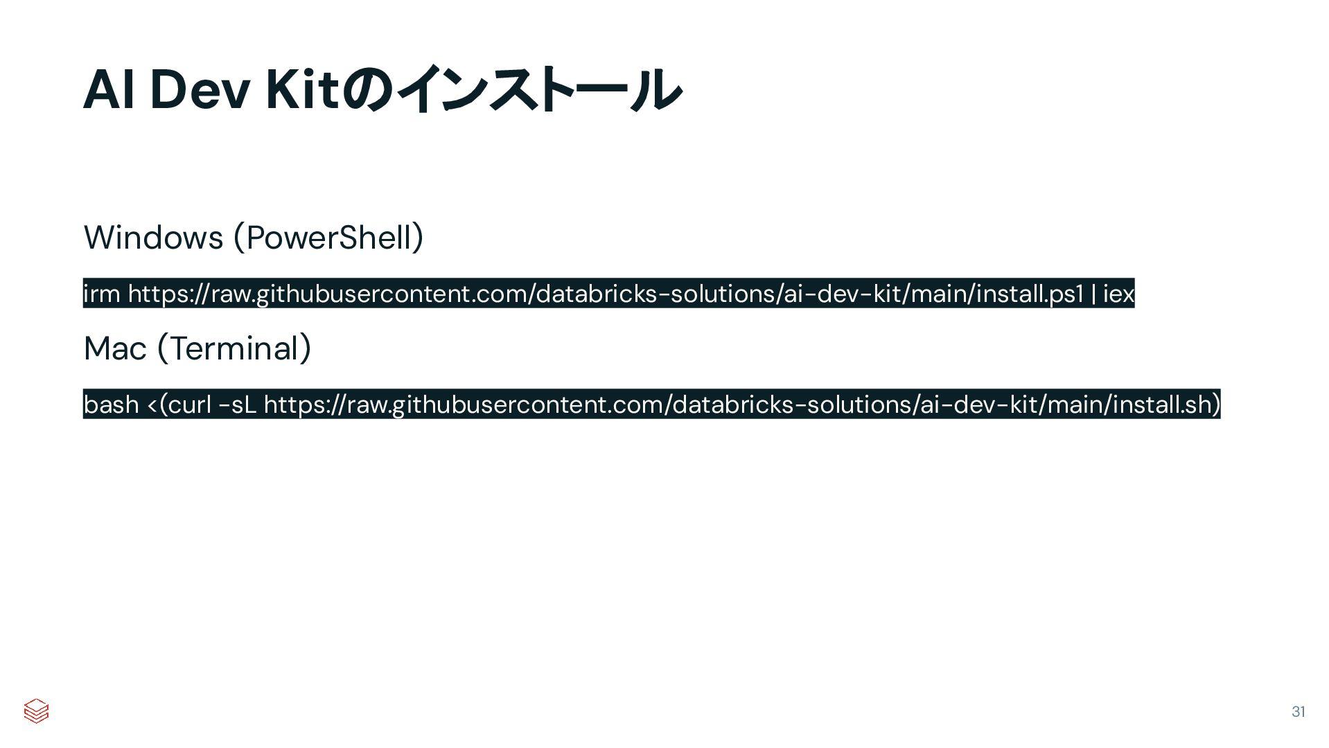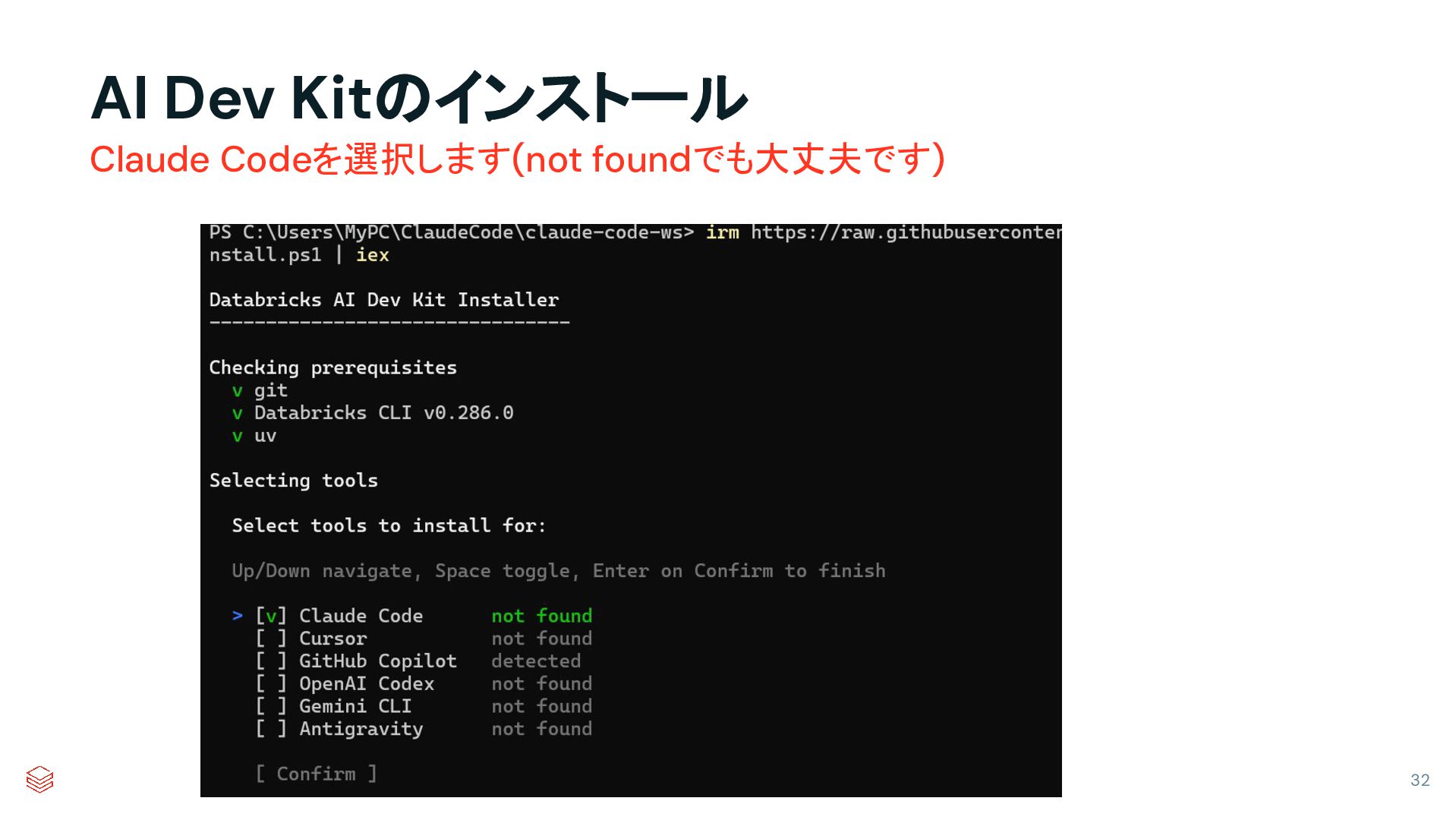 AI Dev Kitのインストール 31 Windows (PowerShell) irm https://raw.githubusercontent.com/databricks-solutions/ai-dev-kit/main/install.ps1 | iex