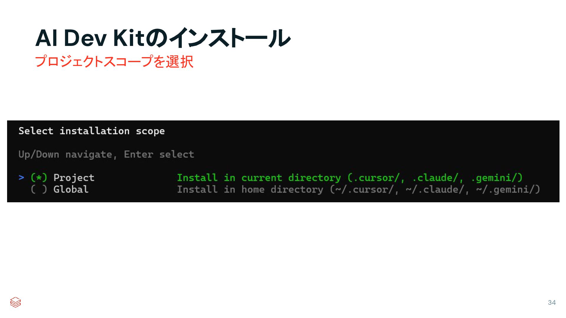 • ワンライナーでインストール(Mac / Linux / Windows対応) • プロジェクトスコープ(推奨)またはグローバルスコープ • 対応AIアシスタント: