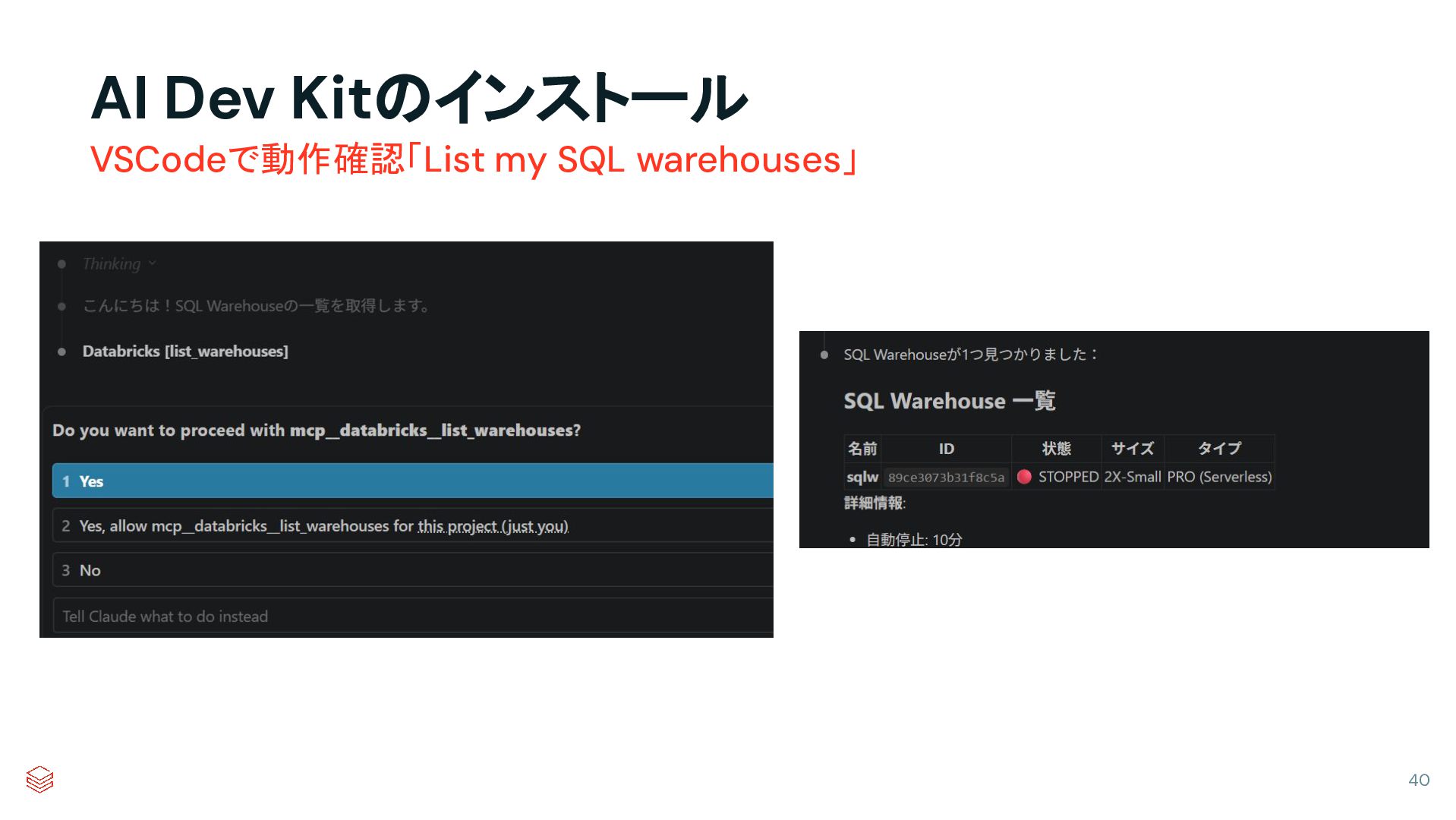 AI Dev Kitのインストール 40 VSCodeで動作確認「List my SQL warehouses」