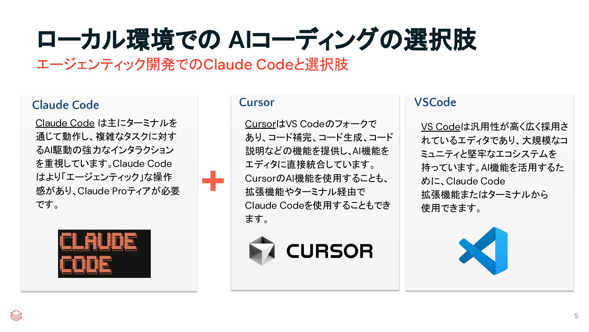 ローカル環境での AIコーディングの選択肢 5 エージェンティック開発でのClaude Codeと選択肢 VS Codeは汎用性が高く広く採用さ れているエディタであり、大規模なコ ミュニティと堅牢なエコシステムを 持っています。AI機能を活用するた