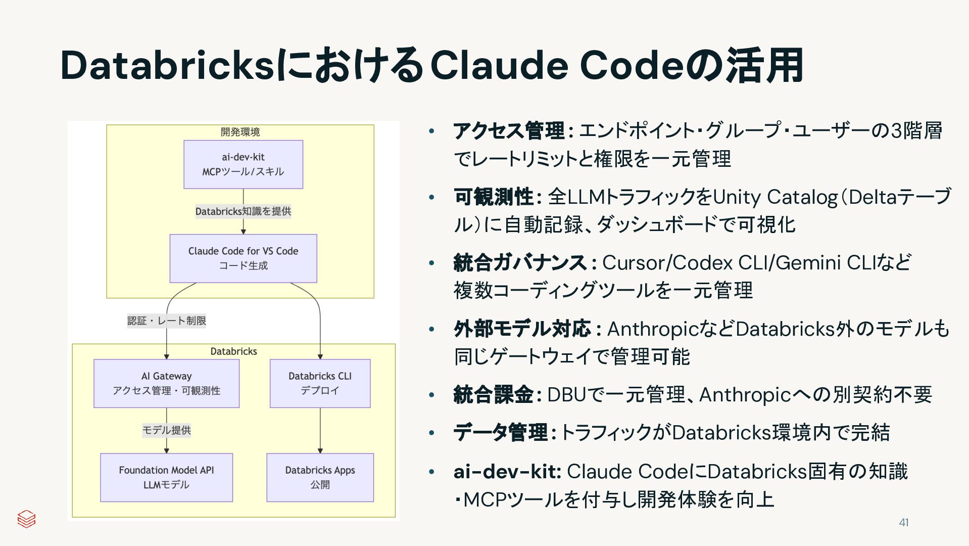 全LLMトラフィックをUnity Catalog(Deltaテーブ ル)に自動記録、ダッシュボードで可視化 • 統合ガバナンス : Cursor/Codex CLI/Gemini CLIなど 複数コーディングツールを一元管理 • 外部モデル対応 : AnthropicなどDatabricks外のモデルも 同じゲートウェイで管理可能 • 統合課金: DBUで一元管理、Anthropicへの別契約不要 • データ管理 : トラフィックがDatabricks環境内で完結 • ai-dev-kit: Claude CodeにDatabricks固有の知識 ・MCPツールを付与し開発体験を向上