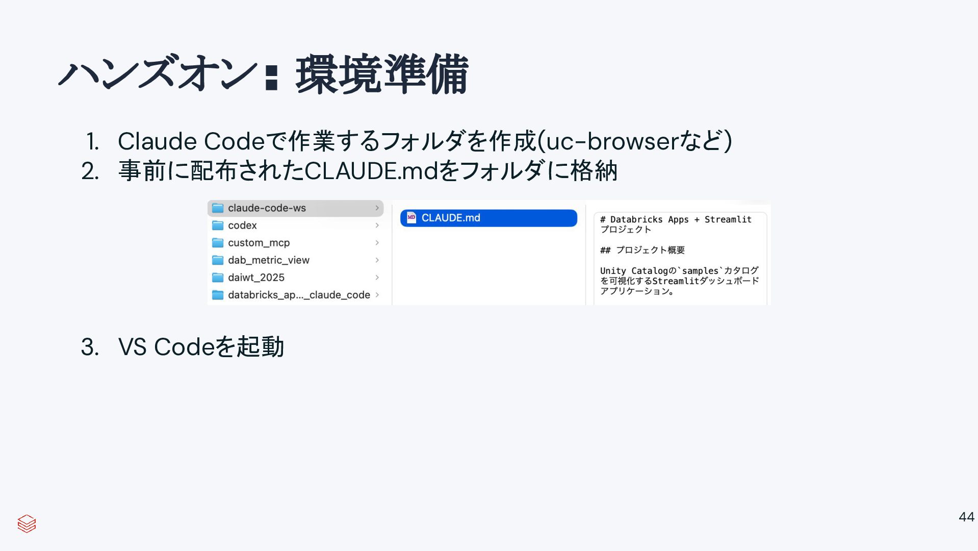 2 基本操作 5分 基本的な問い合わせ、スラッシュコマンドなどに慣れる 3 雛形作成 10分 Claude Codeでアプリの雛形を生成 4 機能追加 10分 対話的に機能を追加 5 デプロイ 10分 Databricks Appsにデプロイ 💡 詰まったらエラーをClaude Codeに貼り付けて相談! 43