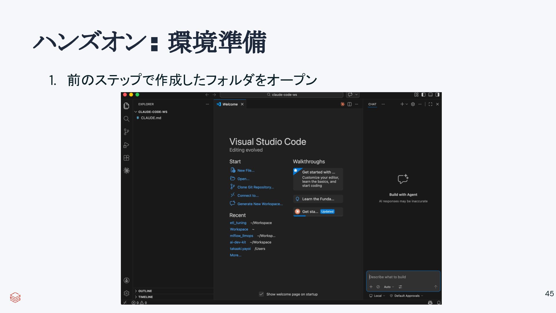 ハンズオン : 環境準備 45 1. 前のステップで作成したフォルダをオープン