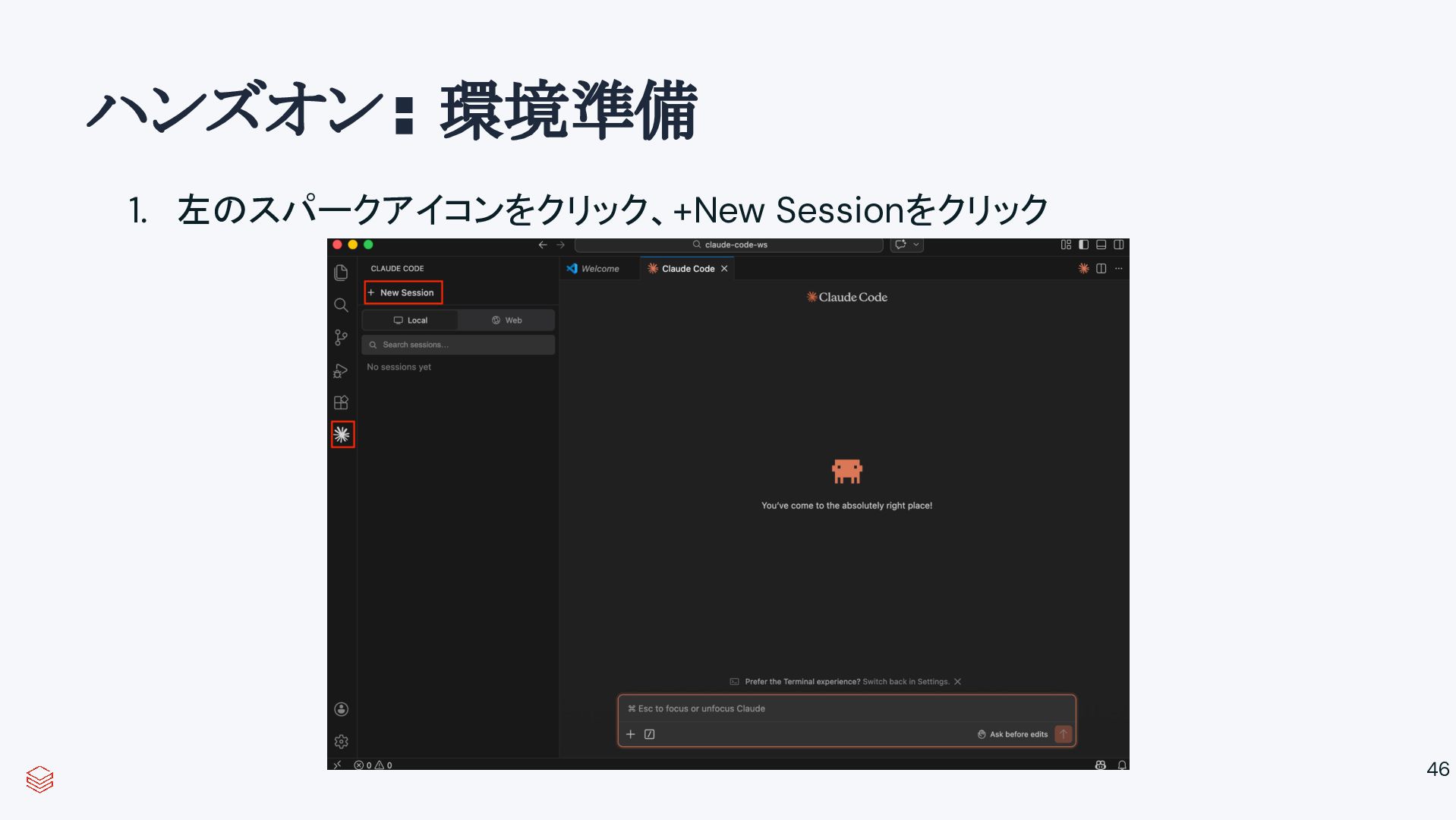 ハンズオン : 環境準備 46 1. 左のスパークアイコンをクリック、+New Sessionをクリック