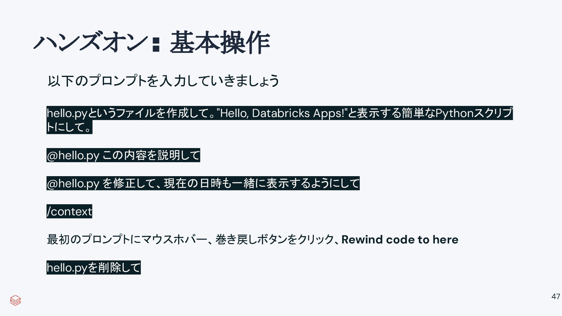 ハンズオン : 基本操作 47 以下のプロンプトを入力していきましょう hello.pyというファイルを作成して。"Hello, Databricks Apps!"と表示する簡単なPythonスクリプ トにして。 @hello.py